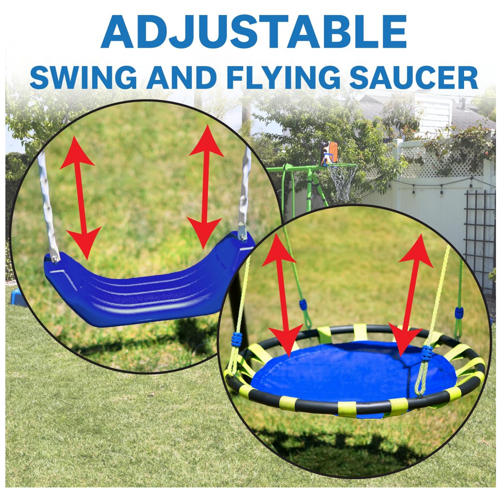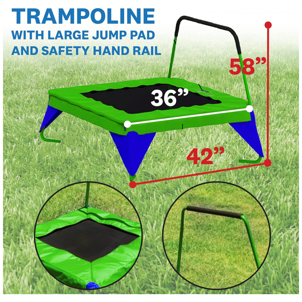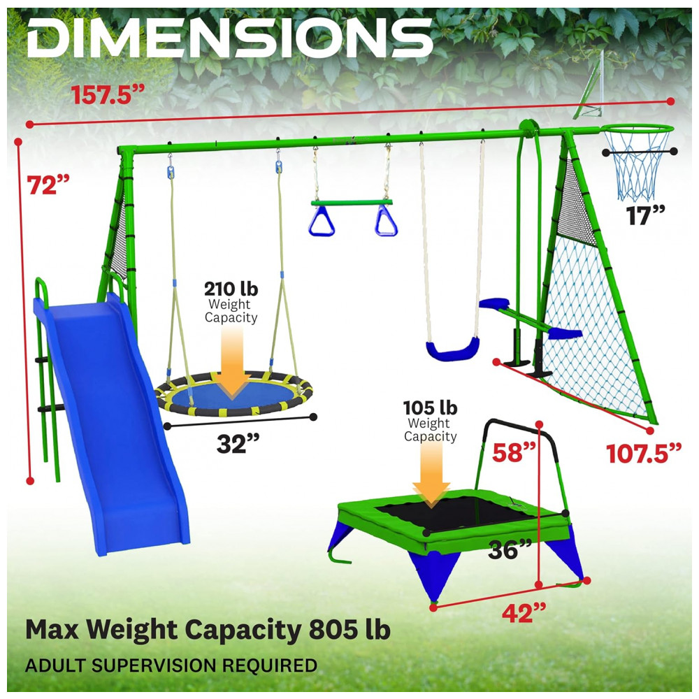 O trampolim fitness incluso possui diâmetro aproximado de 91 cm, com estrutura em aço, molas tratadas termicamente e barra de apoio para uso estável. O disco voador possui diâmetro de cerca de 81 cm, suspenso por cabos, permitindo uso individual. O conjunto suporta uso simultâneo de até nove crianças dentro da faixa de peso recomendada, otimizando o aproveitamento do espaço externo com múltiplas atividades de balanço, escalada leve e deslizamento. A altura máxima aproximada do conjunto é de 265 cm, com largura de cerca de 400 cm e profundidade de 273 cm, devendo ser instalado em piso nivelado e área livre de obstáculos.