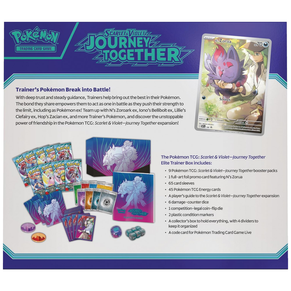 O produto inclui uma carta promocional full-art foil de N’s Zorua, 65 sleeves para proteção de cartas e 45 cartas de Energia Pokémon TCG em padrão atual. Acompanha ainda guia do jogador da expansão Journey Together, seis dados de contador de dano, um dado para sorteio de cara ou coroa em competições e dois marcadores de condição em plástico rígido.
