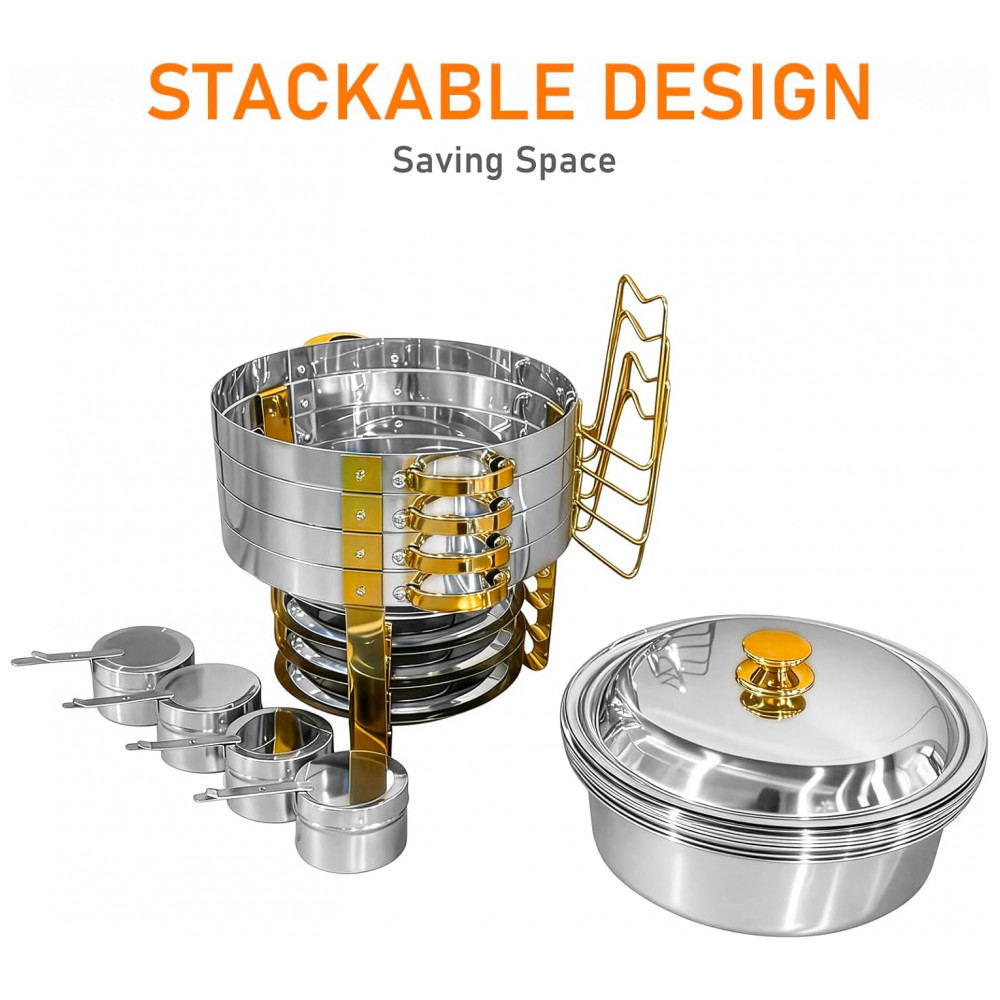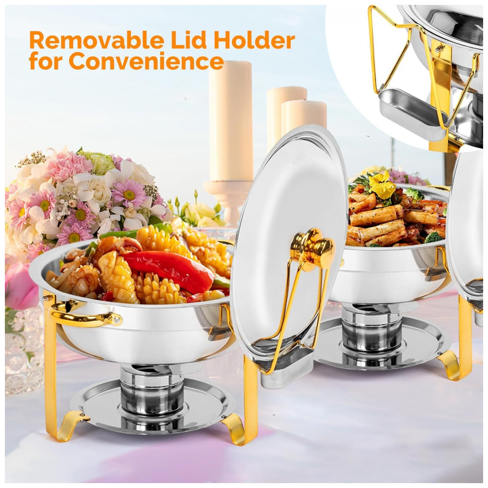 CONJUNTO COMPLETO DE ACESSÓRIOS Este conjunto de rechauds contém 4 ções, 4 suportes de combustível de segurança, 4 recipientes para água, 4 recipientes para alimentos e 4 tampas. O rechaud também possui alças para garantir que o produto possa ser movido com facilidade.