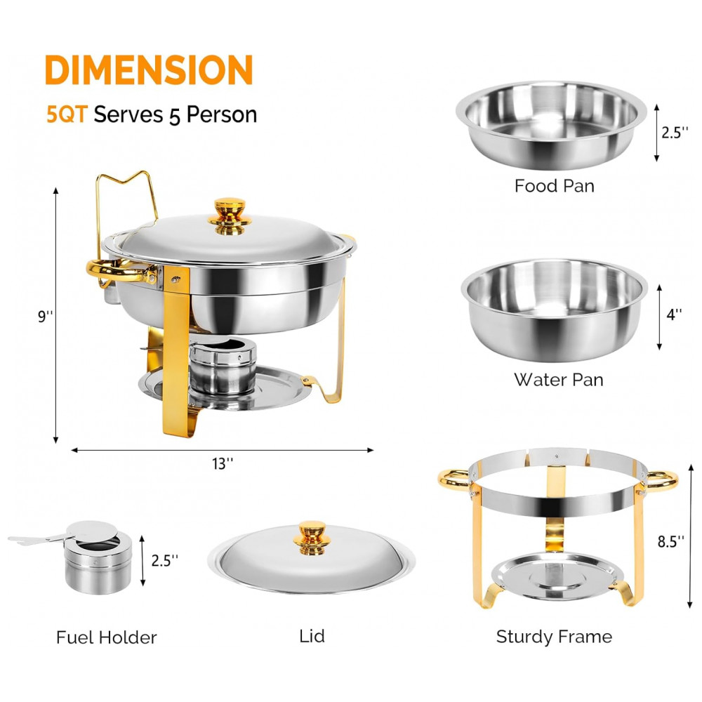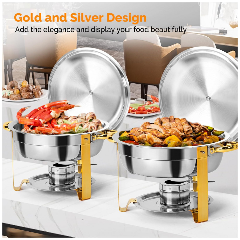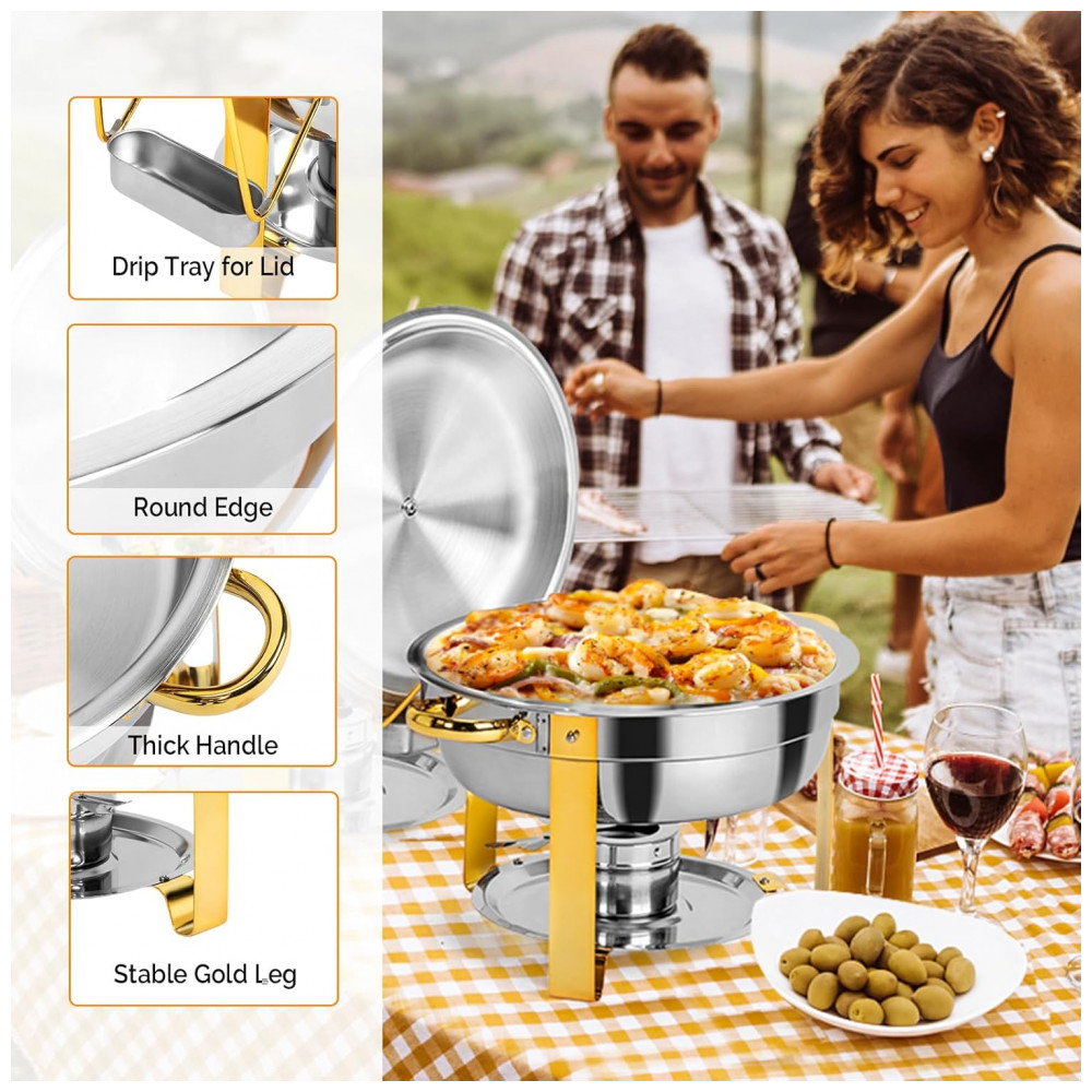 AMPLA APLICAÇÃO Cada prato pode conter 5 litros, é a escolha perfeita como aquecedor de bufê, bandejas e aquecedores de bufê, kit de bufê, para serviço de bufê e alimentação. Amplamente utilizado em bufês, áreas de café da manhã e brunch de hotéis, casamentos, festas, banquetes e qualquer evento