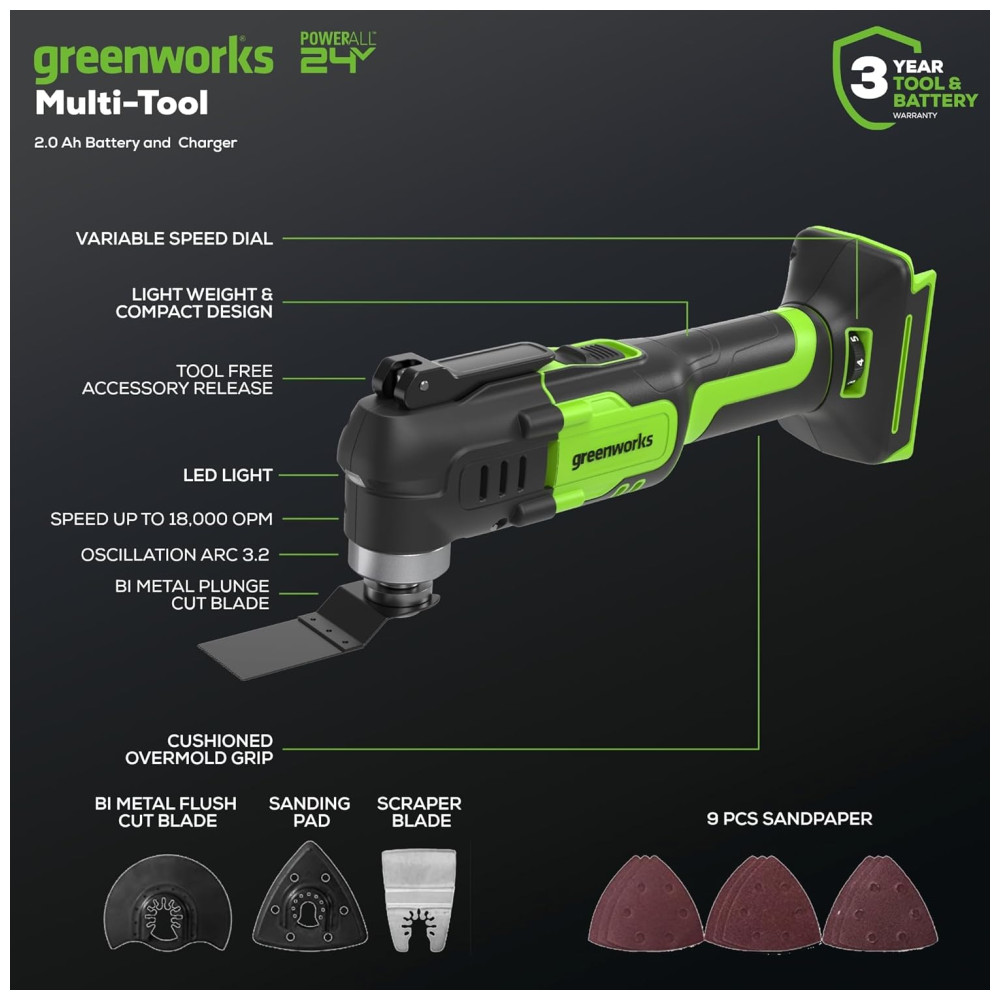 Ecológico e de Baixa Manutenção: Esse kit da Greenworks é ecologicamente correto, emitindo zero emissões e sendo 3 vezes mais silencioso que os equivalentes a gasolina. O sistema inteligente de motor do cortador de grama possui 80 peças móveis a menos do que os cortadores a gasolina, reduzindo a manutenção e o tempo de inatividade. A multi ferramenta, com sua construção durável e design eficiente, também requer manutenção mínima, fornecendo desempenho confiável.