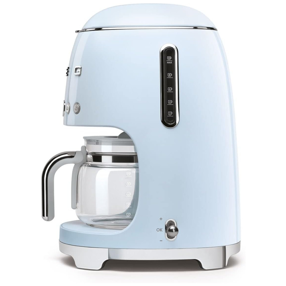 Desfrute de um delicioso café coado e torradas com muito estilo usando este conjunto de cafeteira e torradeira da Smeg. Conhecida por seus eletrodomésticos com visual retrô dos anos 50, criados em parceria com renomados arquitetos, a Smeg combina design icônico do meio do século com recursos modernos. Esta cafeteira não só adiciona um toque de nostalgia à sua cozinha, mas também oferece funcionalidades convenientes. Escolha entre uma variedade de cores deslumbrantes que harmonizam com outros eletrodomésticos da Smeg, criando uma coleção coordenada. Aproveite a liberdade para personalizar seu café e experiência com recursos como início automático e controle de aroma, permitindo que você prepare uma xícara adequada ao seu gosto e horário. Combine os recursos da cafeteira com os seis níveis de tostagem da torradeira para criar o começo perfeito da manhã. Utilize o recurso de Início Automático para programar o horário de preparo, permitindo que você acorde com seu café favorito. Escolha entre duas configurações de aroma, Delicado padrão ou Intenso, para personalizar a força do seu café. Prepare facilmente pequenas quantidades com a configuração de 14 xícaras. A torradeira possui duas aberturas generosamente largas para torradas. Desfrute de controle preciso sobre a tostagem com seis níveis ajustáveis.