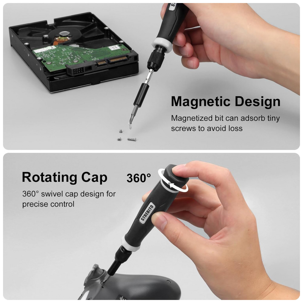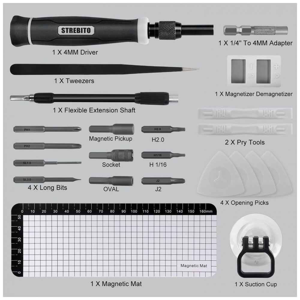 O conjunto STREBITO 153 em 1 de chaves de precisão magnéticas contém 140 bits para reparos eletrônicos, incluindo perfis Phillips, Pentalobe, Torx Security, Star, Hex SAE/Métrico, JIS, Flathead, Triwing, Triangle e Square. Projetado para manutenção de PC, laptops, celulares, Macbook, carros RC, drones, Nintendo Switch, controles PS4, relógios, óculos, máquinas de café, Ring Doorbell e outros dispositivos IT.