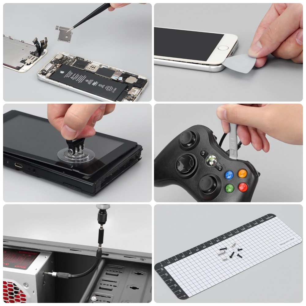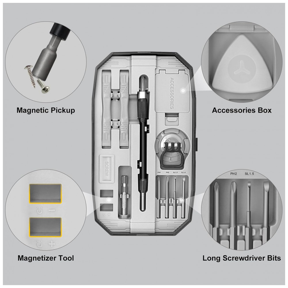 Bits fabricados em aço CRV e liga de aço para durabilidade e encaixe preciso, com alça em PP e TPR ergonômica de aderência suave e tampa giratória para controle de torque. Ferramentas de pry em nylon protegem superfícies delicadas; inclui 13 acessórios como pickup magnético, tapete magnético, magnetizador/desmagnetizador e 4 bits de pescoço longo para áreas de difícil acesso.