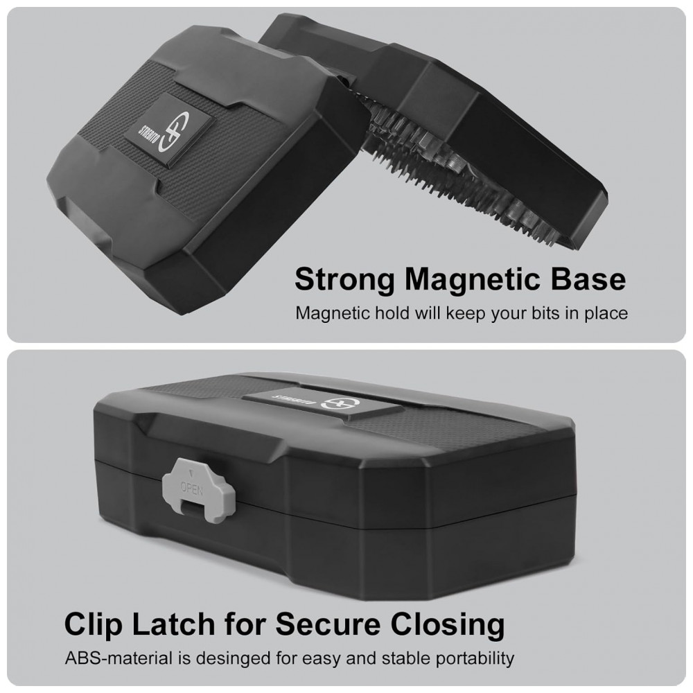 Estojo plástico rígido organiza bits em slots moldados magnéticos com etiquetas de tamanho e compartimentos para acessórios. Fecho com trava de clipe assegura proteção no transporte e armazenamento.