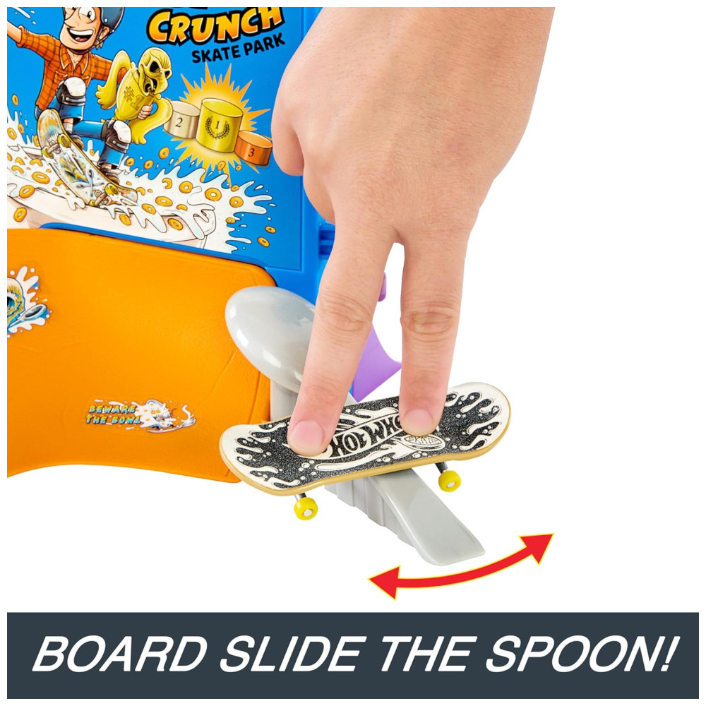 Suba pela rampa na parte de trás da caixa e esmerilhe a grade no topo para expor o troféu do campeão. Em seguida, desça pela frente e use a tigela de cereal e a colher ajustável para realizar ainda mais truques.