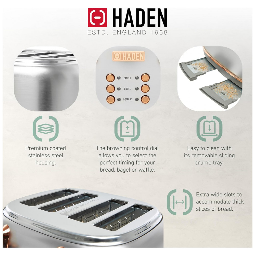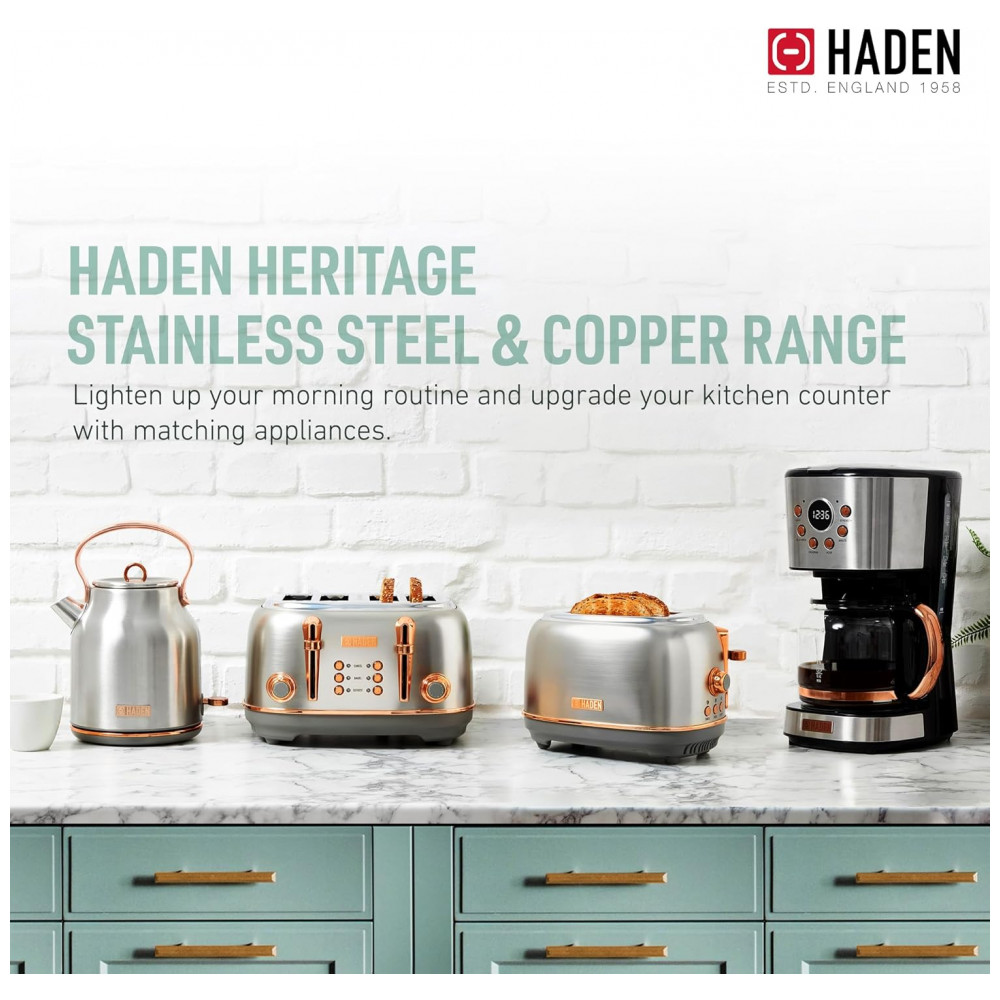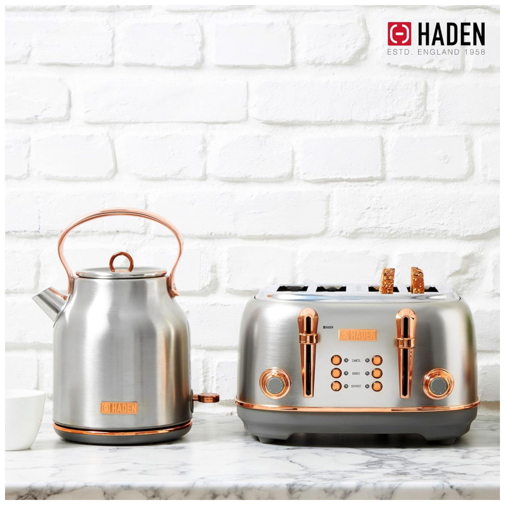 O conjunto HADEN Heritage reúne uma torradeira elétrica de 4 fatias com fendas largas e uma chaleira elétrica em aço inox com capacidade de 1,7 litro, ambas em acabamento preto e cromado para uso em cozinhas residenciais. A torradeira integra função de centragem automática nas quatro fendas, permitindo torrar pães, bagels, waffles e fatias mais espessas com ajuste de tempo por controle de tostagem.
