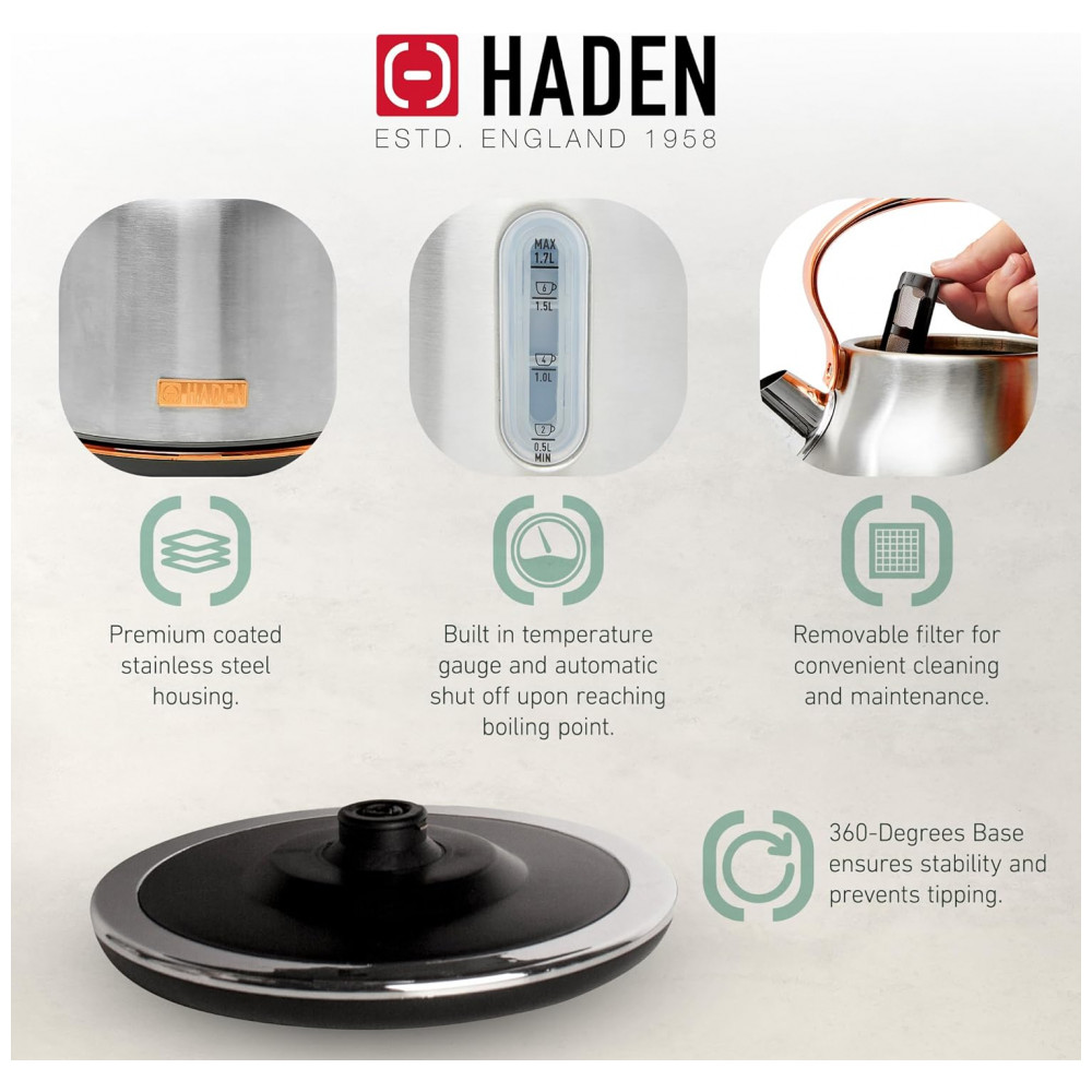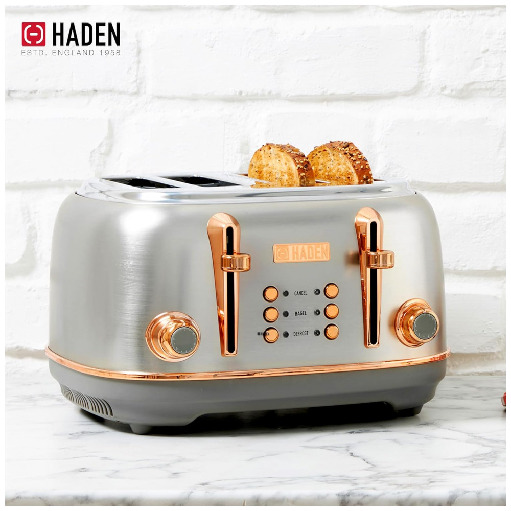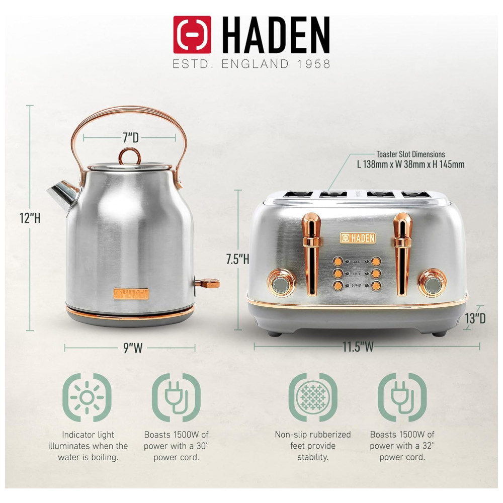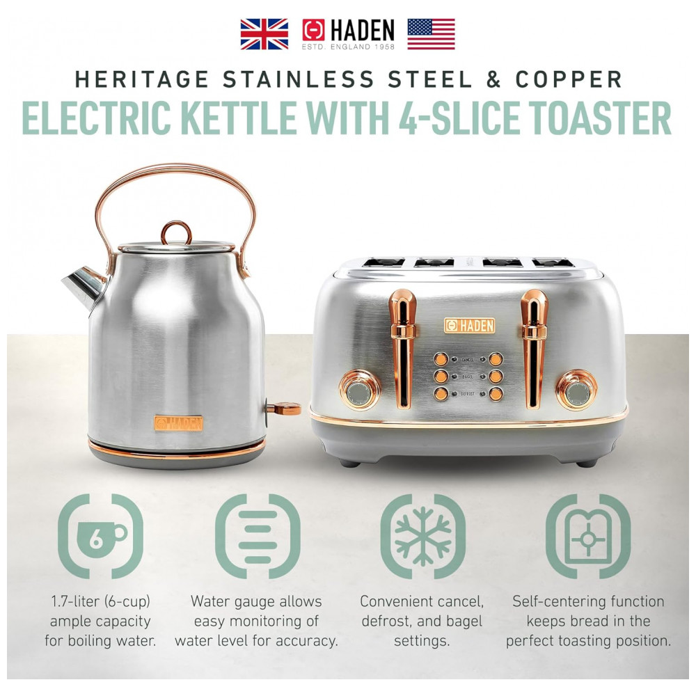 O conjunto HADEN Heritage reúne uma torradeira elétrica de 4 fatias com fendas largas e uma chaleira elétrica em aço inox com capacidade de 1,7 litro, ambas em acabamento preto e cromado para uso em cozinhas residenciais. A torradeira integra função de centragem automática nas quatro fendas, permitindo torrar pães, bagels, waffles e fatias mais espessas com ajuste de tempo por controle de tostagem.