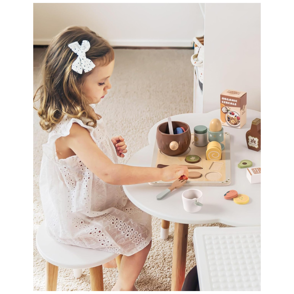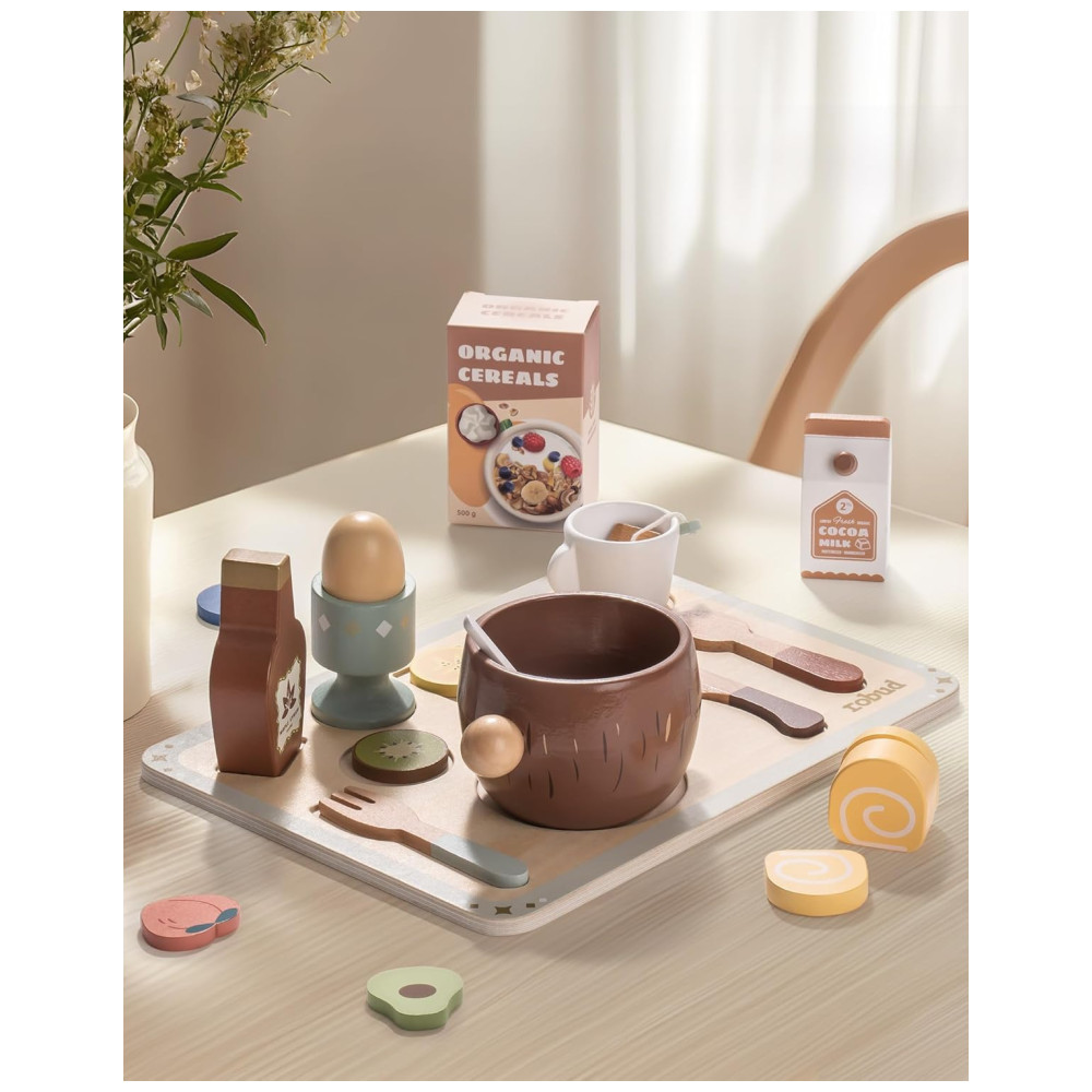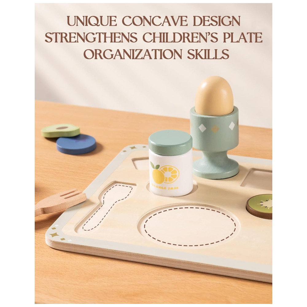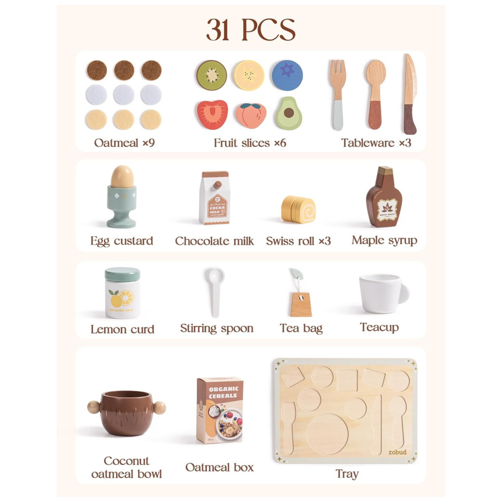 O Conjunto de Comida de Madeira ROBUD com 31 peças apresenta um design exclusivo em cada peça, combinando perfeitamente com seu prato correspondente. Isso ajuda as crianças a praticar a classificação e o armazenamento, enquanto aprimora suas habilidades organizacionais. Com 31 acessórios, incluindo xarope de bordo, creme de limão, pudim, rolinhos suíços, leite de chocolate, tigela de aveia com coco, xícara de chá, saquinho de chá, colher de mexer, talheres, fatias de frutas, pedaços de aveia e caixa de aveia, este conjunto oferece infinitas possibilidades de brincadeiras. Feito de madeira de alta qualidade e lisa, cada peça é durável, garantindo que possa resistir às exigências do jogo imaginativo. Projetado para ser usado com uma cozinha de brinquedo, este conjunto duplica a diversão, permitindo que as crianças se envolvam em cenários de brincadeira mais complexos e realistas, desde a preparação até a servir suas refeições. Ideal para brincadeiras Montessori, este conjunto inspirado na filosofia Montessori estimula a aprendizagem independente e o desenvolvimento motor fino. A variedade de alimentos e utensílios é perfeita para crianças pequenas, sendo uma escolha ideal para pais em busca de brinquedos educativos.