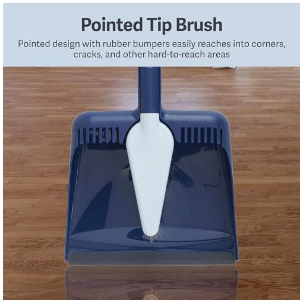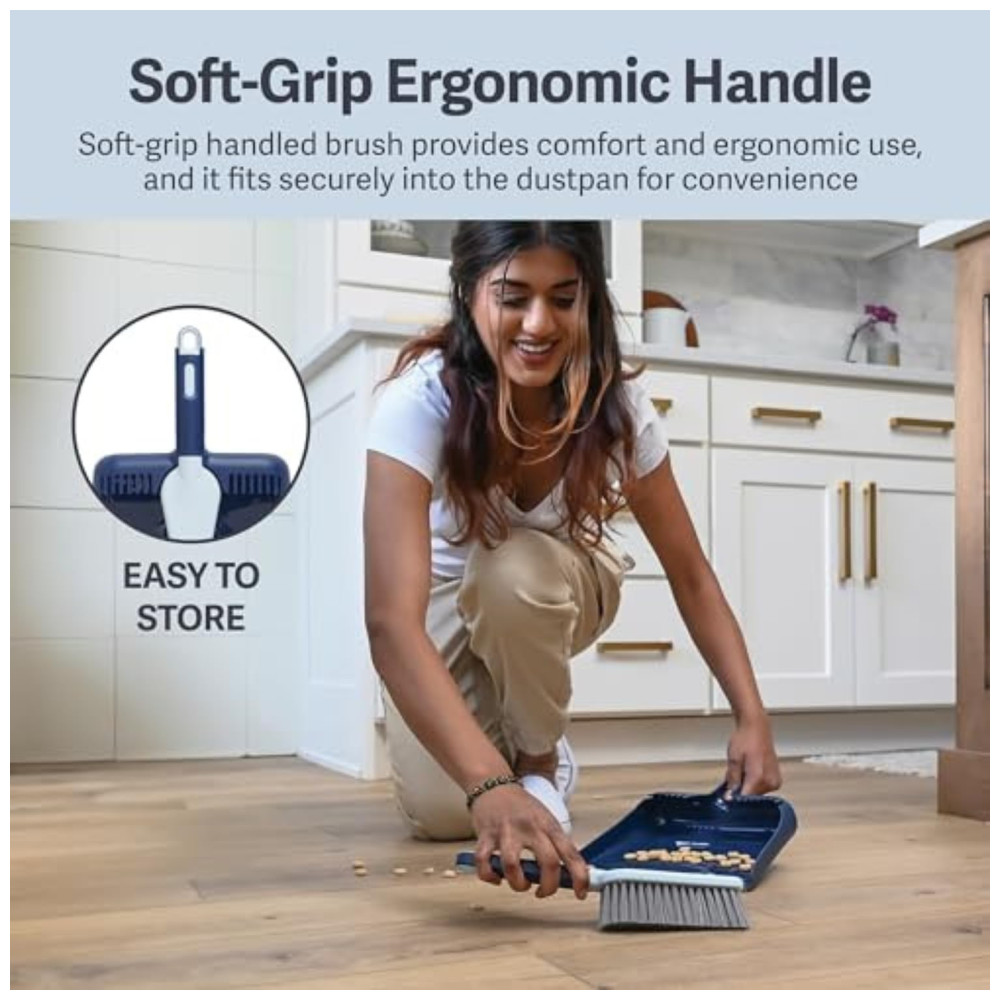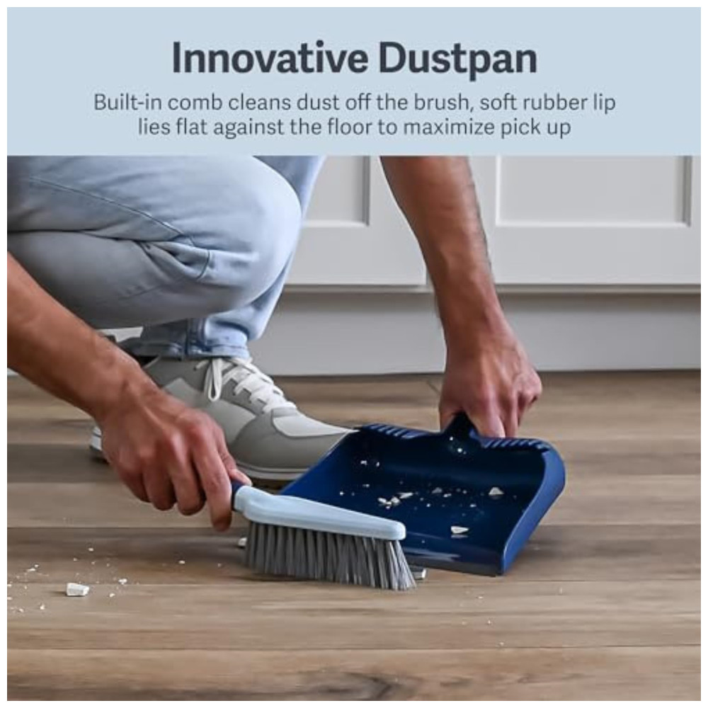 DUSTPAN INOVADOR Projetado com um pente embutido para limpar a poeira da escova, e o lábio de borracha macia fica plano contra o chão para maximizar a coleta