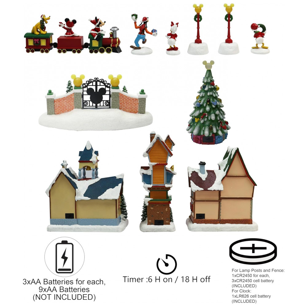 Transforme sua decoração de Natal com o conjunto Moments in Time Vila Natalina Disney, composto por 13 peças ricamente detalhadas, pintadas à mão e feitas em polyresina. Este conjunto encantador traz personagens clássicos da Disney, como Mickey, Minnie, Pateta, Donald, Margarida e Pluto, juntamente com edifícios festivos e uma árvore de Natal iluminada, criando um cenário natalino nostálgico e alegre. Equipado com luzes LED e um sistema musical que toca 8 canções clássicas de Natal — incluindo “We Wish You a Merry Christmas”, “Jingle Bells” e “Silent Night” —, ele traz uma atmosfera mágica para seu ambiente. Alimentado por 3 baterias C (não inclusas), possui temporizador automático com função de 6 horas ligadas e 18 horas desligadas, permitindo uso prático e contínuo. Ideal para presentear, colecionar ou decorar sua casa com a magia Disney durante as festas.