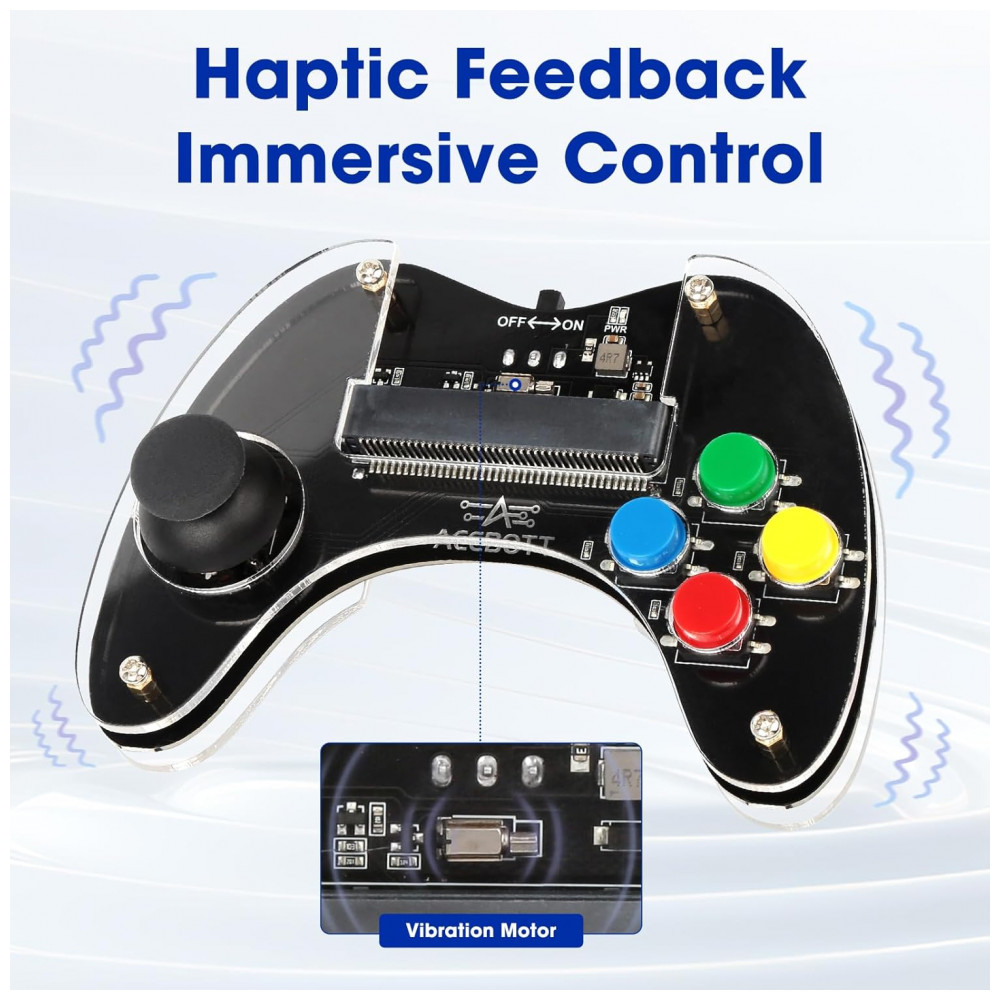 O ACEBOTT Wireless Controller para micro:bit é um controle educativo sem fio projetado para comandar robôs e projetos baseados em micro:bit, com design ergonômico atualizado, empunhadura mais espessa e bordas curvas que aumentam o conforto durante o uso contínuo. O controle reúne joystick, quatro botões responsivos e motor de vibração integrado, proporcionando resposta tátil em tempo real durante a execução dos programas e controle dos robôs. Este kit inclui a placa micro:bit e é compatível com a plataforma MakeCode, permitindo programação em blocos para criar comandos, ações e interações sem fio de forma progressiva para iniciantes.