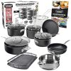 O CONJUNTO INCLUI Frigideira funda aberta de , frigideira funda aberta de , panela coberta de 1,5 litros, panela coberta de 2L, forno holandês coberto de 5L com tampa giratória, refogado de 3L, raspador de banco, Colher Preguiçosa
