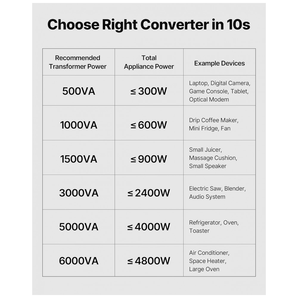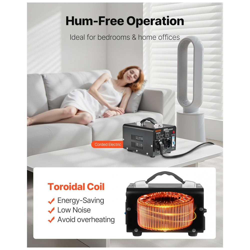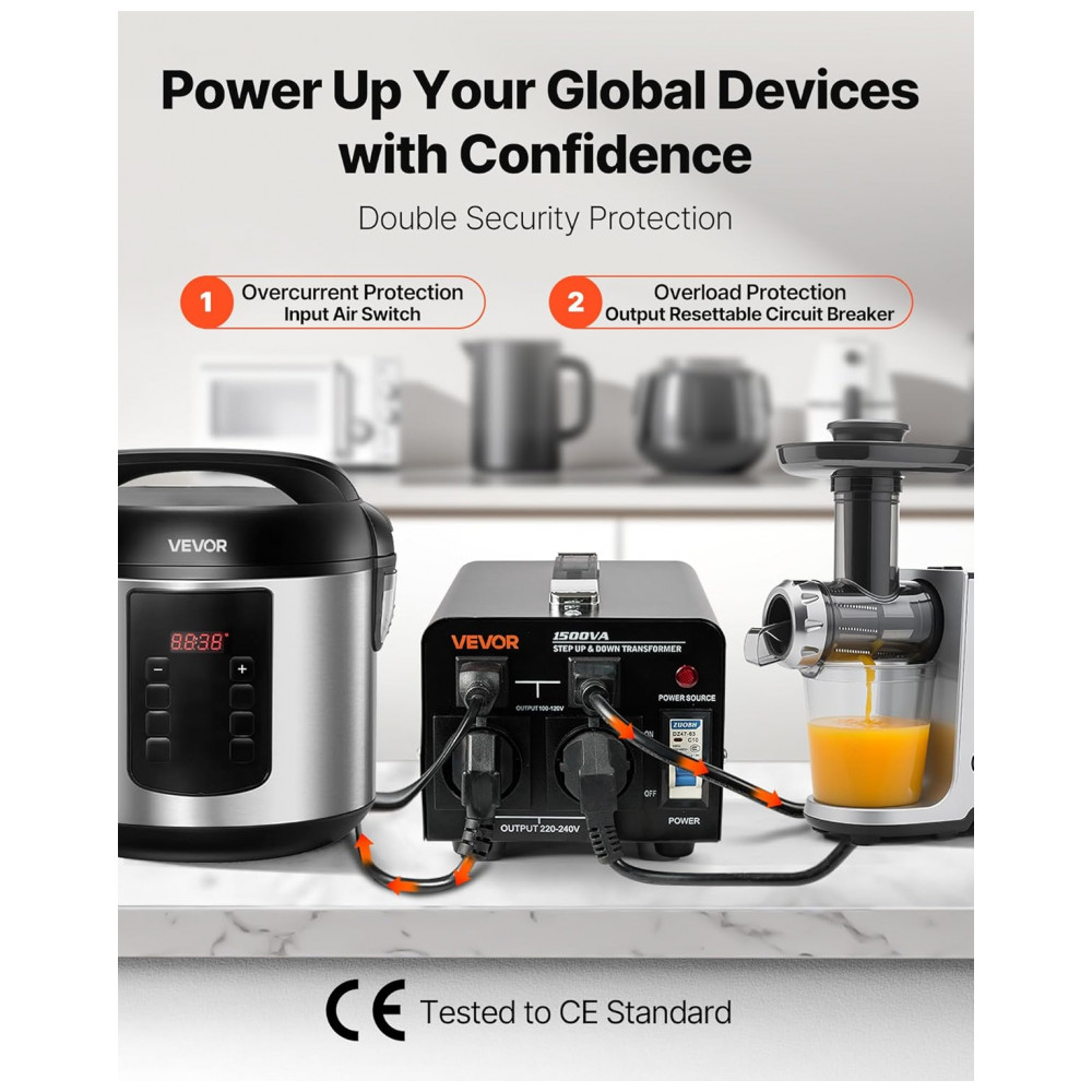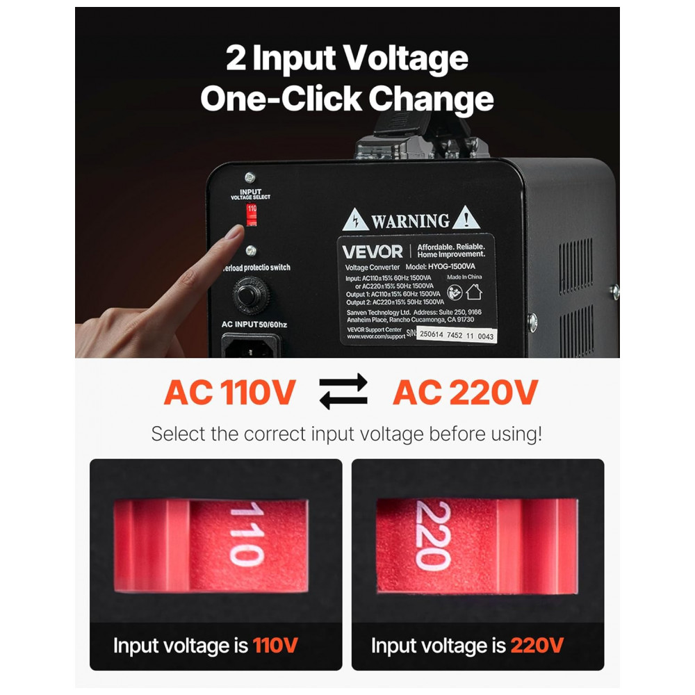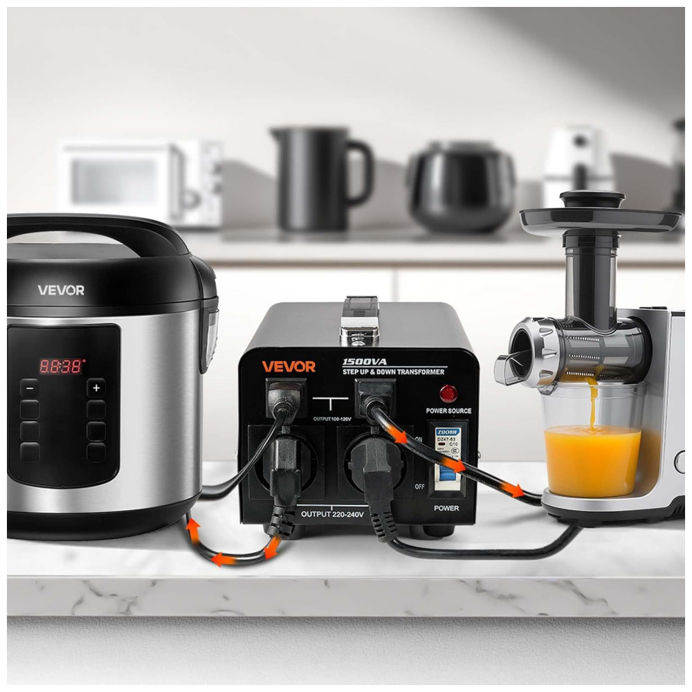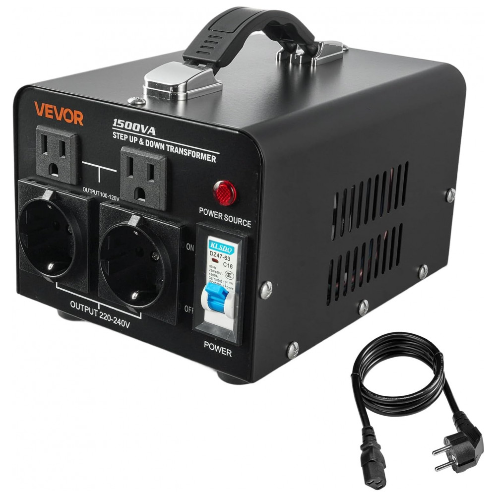 O Conversor de Voltagem Transformer VEVOR 1500VA oferece tecnologia avançada de elevação e redução de tensão, convertendo de 110V para 220V ou de 220V para 110V por meio de um interruptor de seleção de entrada. Antes de ligar, ajuste o conversor para a tensão correta. Inclui cabo de alimentação US; em países com 220V-240V, utilize adaptador de plugue ou cabo local compatível.