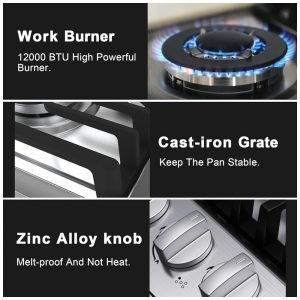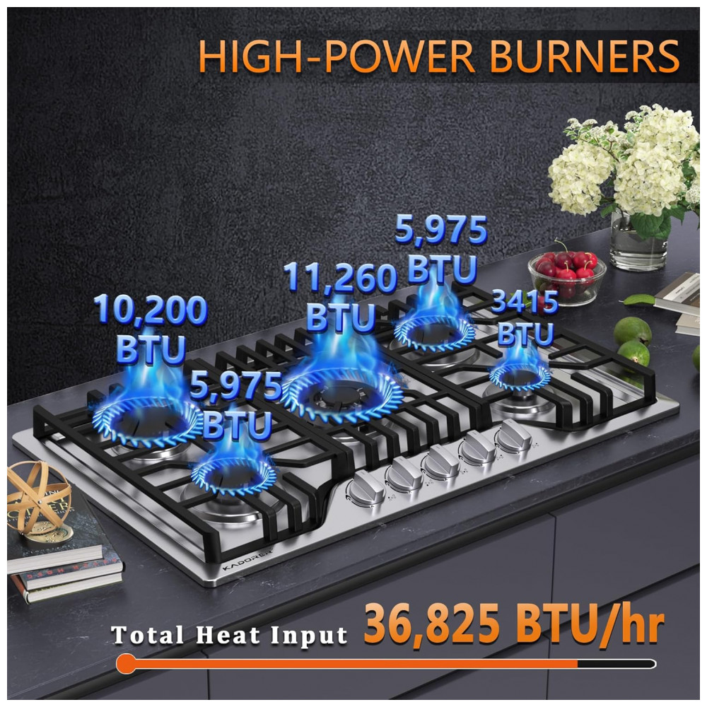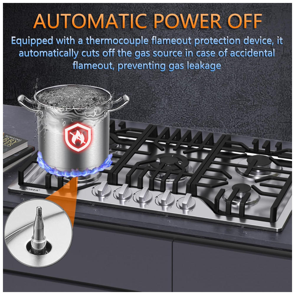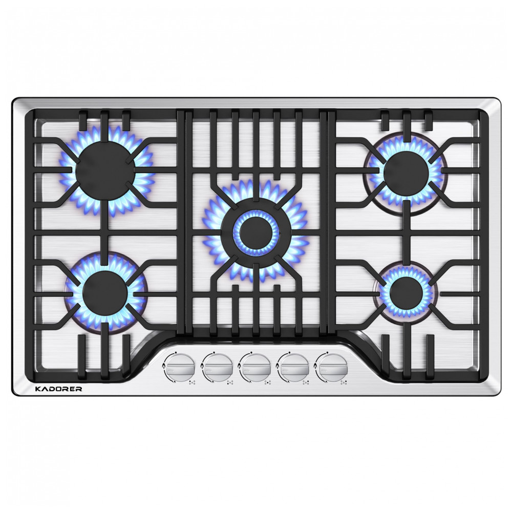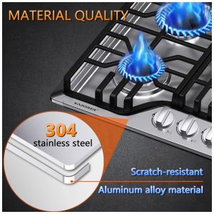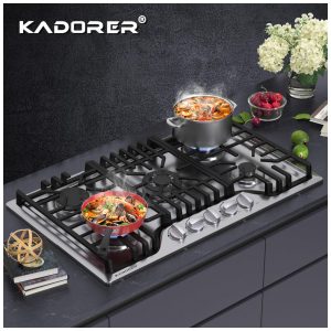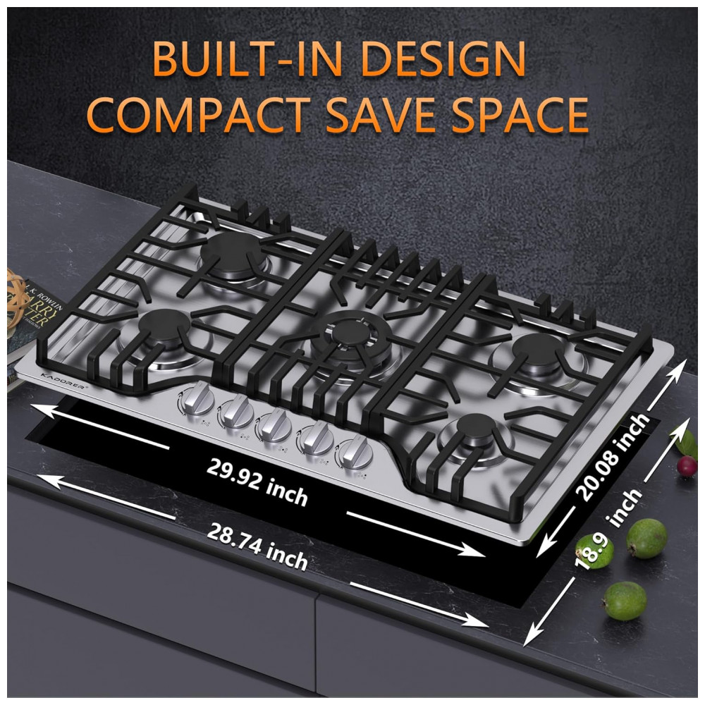 O cooktop a gás de 5 bocas Kadorer 5B-30 é um modelo de embutir com mesa em aço inox 304 escovado, indicado para uso doméstico com alimentação a gás natural ou GLP. A superfície em inox, os queimadores selados e os manípulos em liga de zinco oferecem resistência a altas temperaturas e à corrosão, permitindo limpeza simples com pano úmido e produto neutro.