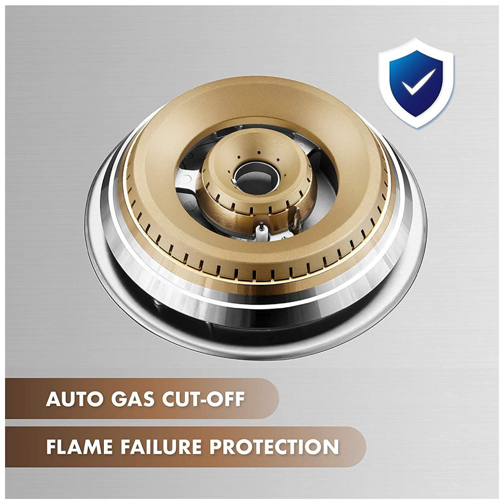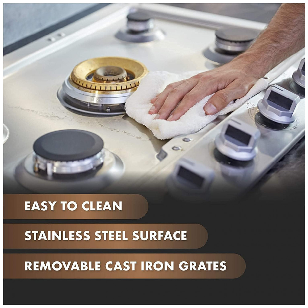 Recursos e tecnologias: Queimador triplo 22.000 BTU dois queimadores 13.000 BTU queimadores auxiliares 6.000 BTU e 3.000 BTU queimadores selados detecção de falha de chama ignição rápida aproximadamente 1 segundo mesa em aço inox 304 bordas chanfradas grades contínuas em ferro fundido suporte para wok kit de instalação kit de conversão para GLP