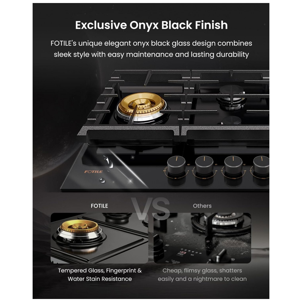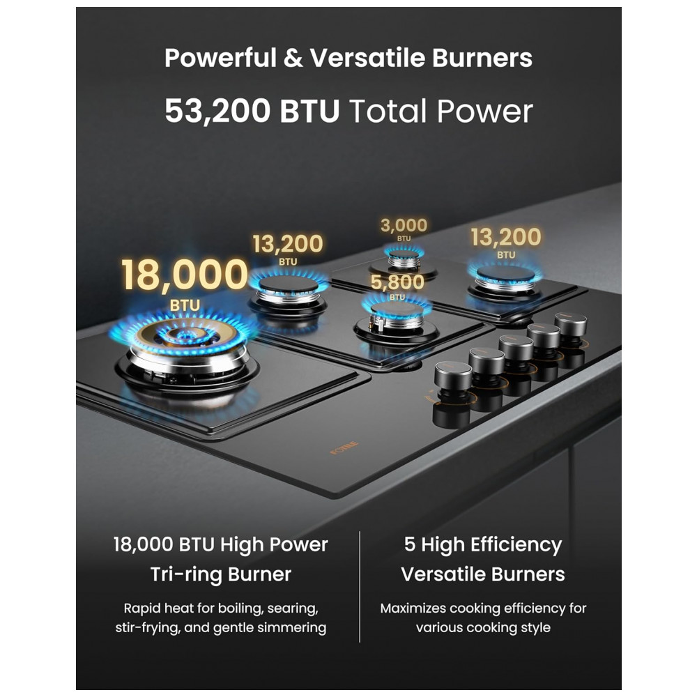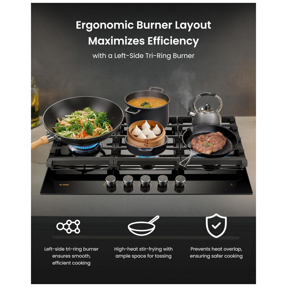 Cooktop a gás 5 queimadores Fotile vidro temperado preto queimador triplo 18.000 BTU layout em losango 110V