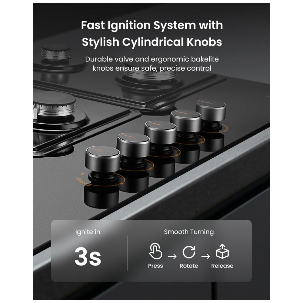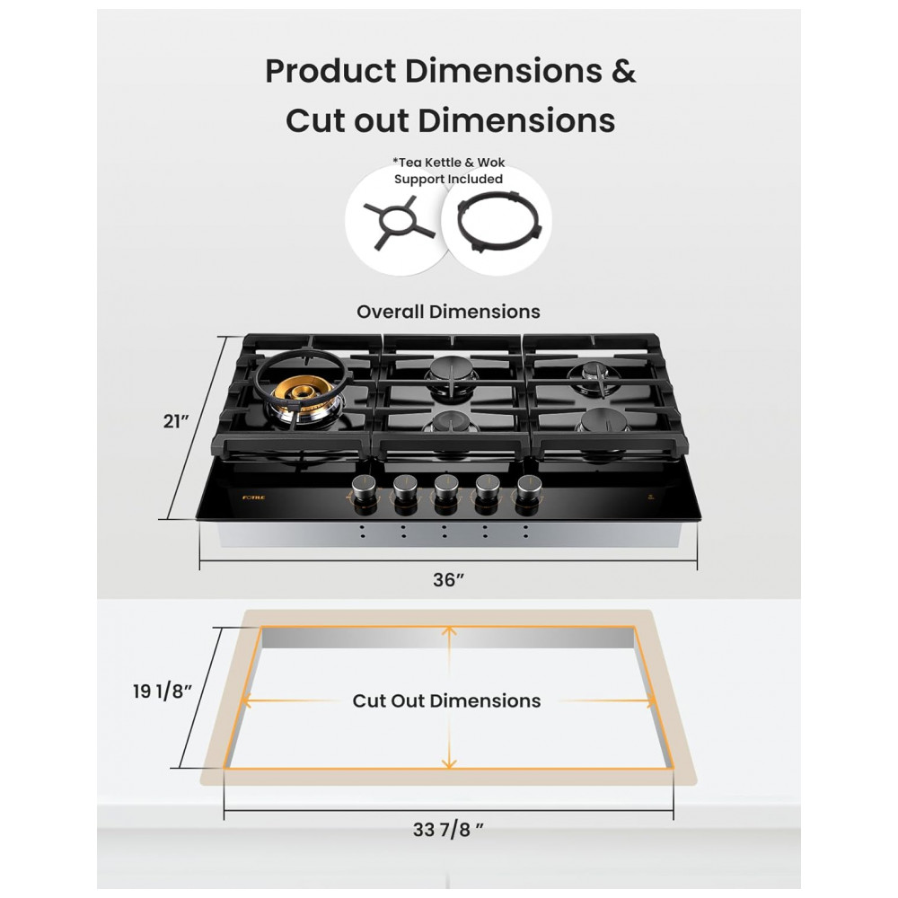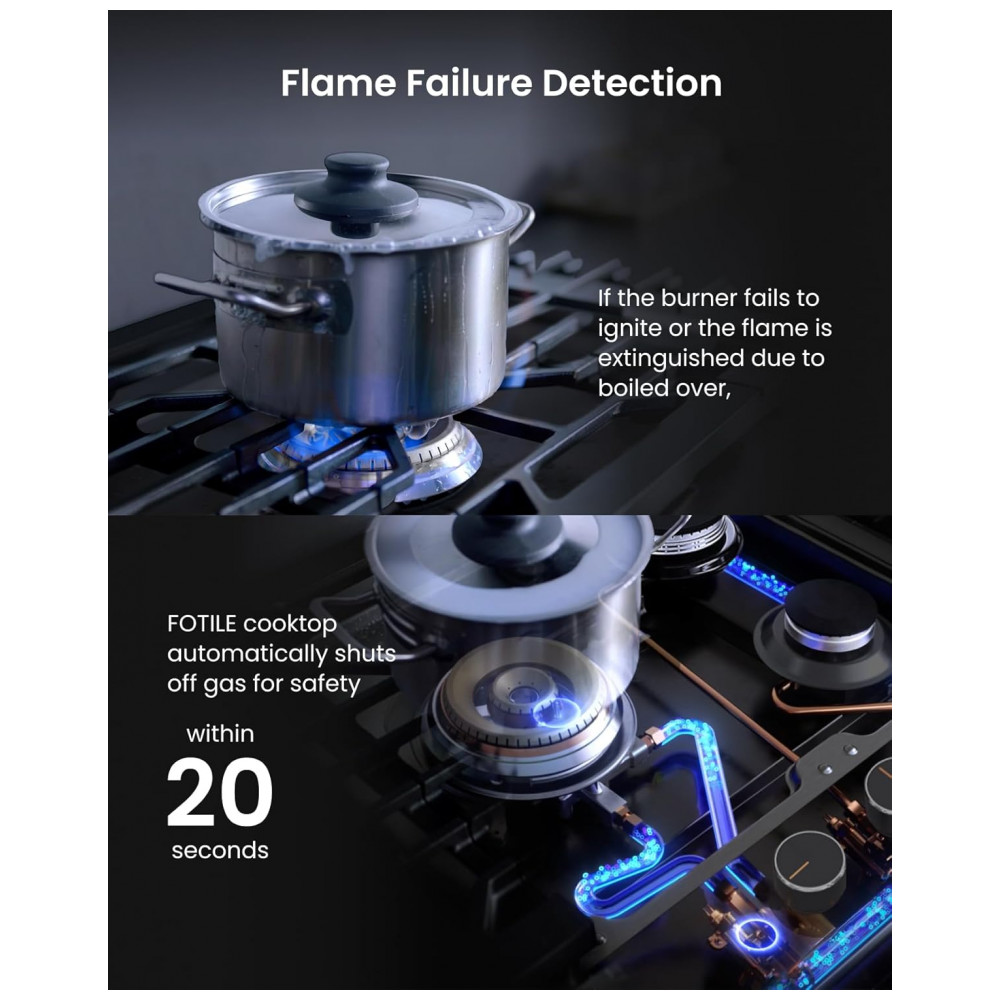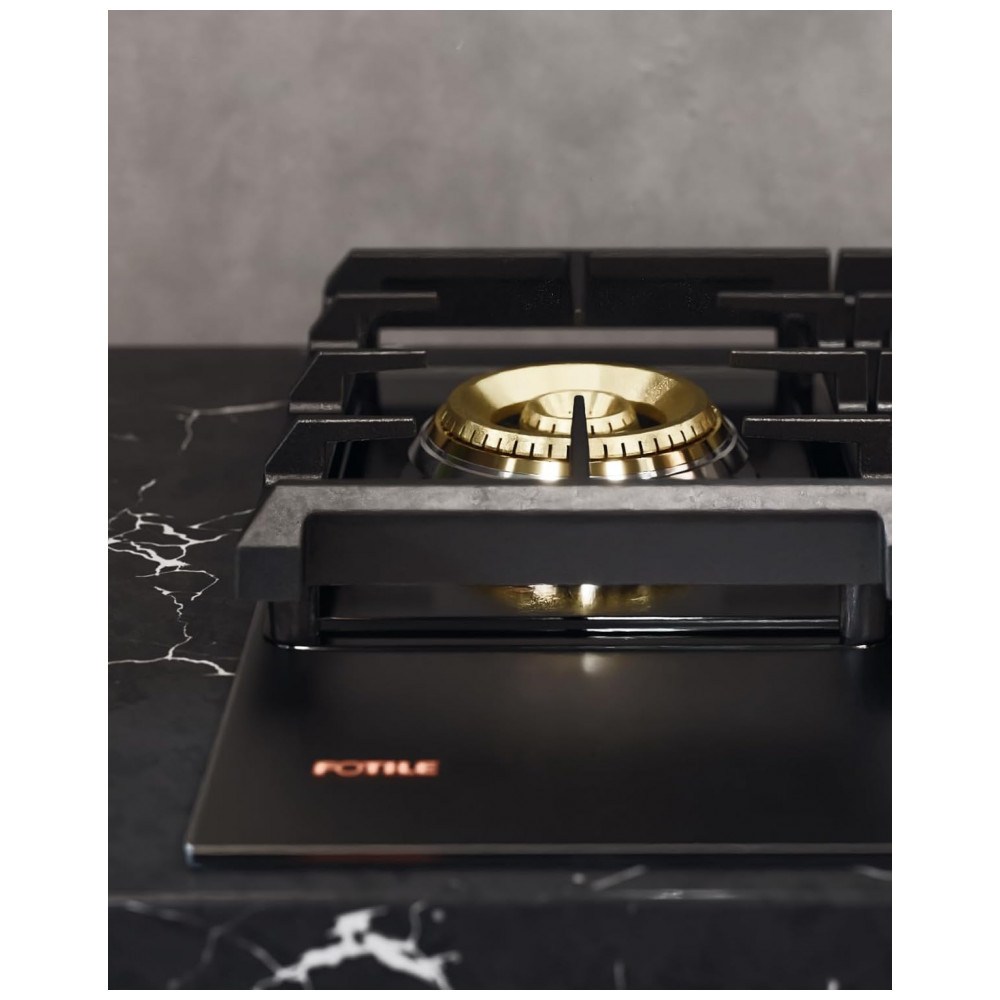 O cooktop a gás Fotile GLG36501 com 5 queimadores é indicado para instalação embutida em cozinhas residenciais que utilizam gás natural ou GLP, com kit de conversão incluído para ajuste ao tipo de gás disponível. A mesa em vidro temperado preto combinada com estrutura em aço inoxidável e grades contínuas em ferro fundido proporciona superfície plana para apoio de panelas, com resistência térmica adequada ao uso diário.