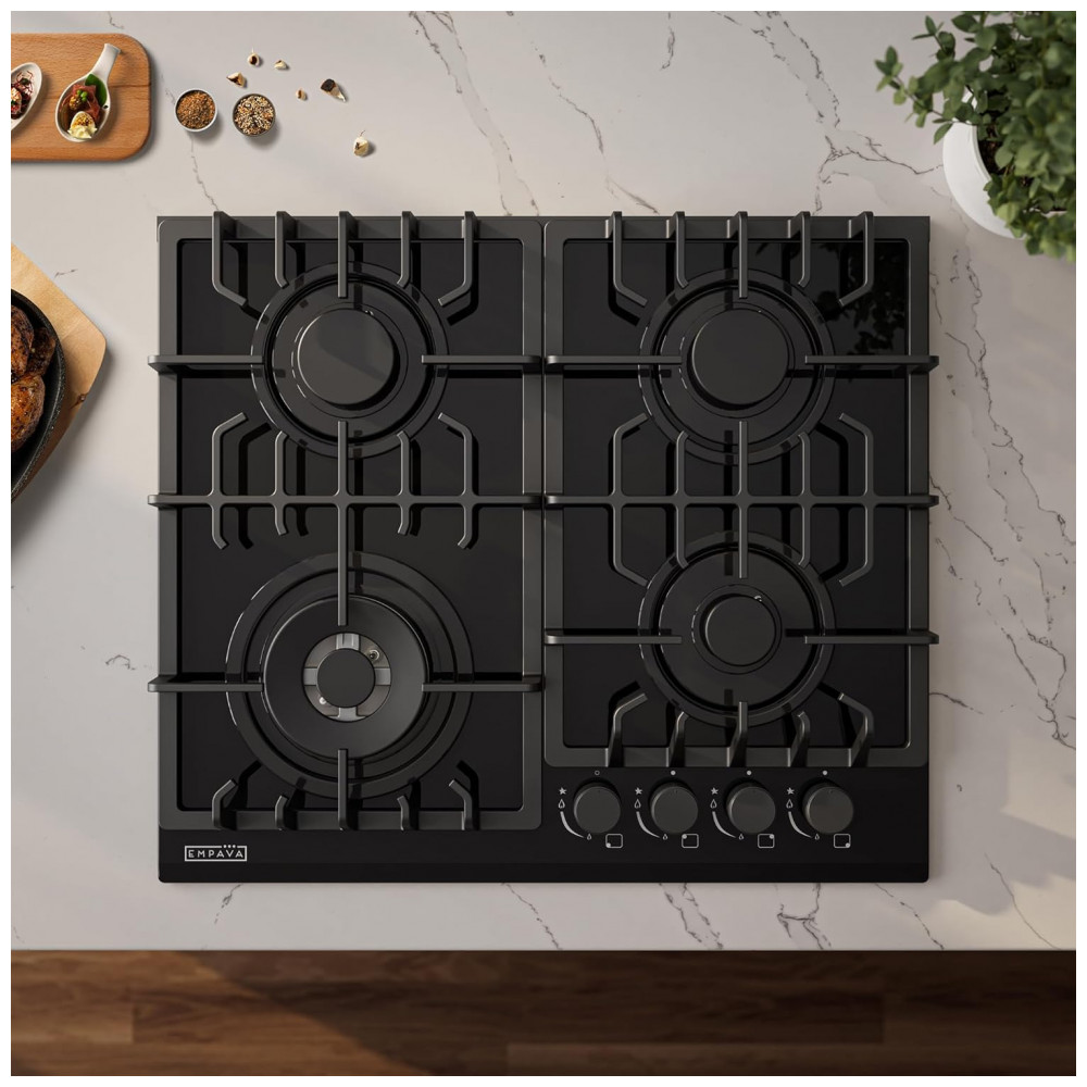 Cooktop a gás 59cm Empava vidro preto 4 queimadores SABAF selados dual fuel GN/GLP grade contínua 110V