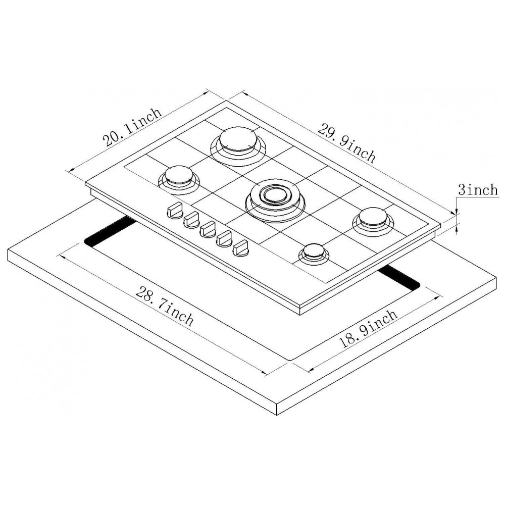 As grades em ferro fundido, combinadas à estrutura em inox, oferecem apoio estável para panelas de diferentes tamanhos, inclusive recipientes mais pesados como woks, mantendo a estabilidade durante o uso contínuo. As dimensões aproximadas de 76,0 cm de largura, 51,0 cm de profundidade e 7,6 cm de altura permitem a instalação em recortes compatíveis com cooktops de 30cm de largura nominal convertida para o padrão métrico.