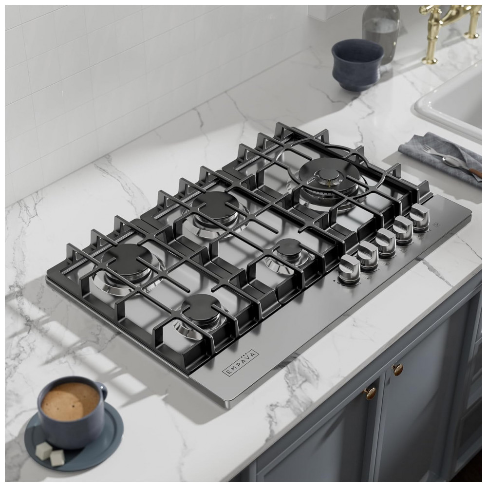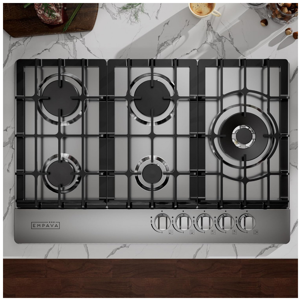 O cooktop a gás 76cm Empava em aço inoxidável utiliza cinco queimadores SABAF selados em mesa rebaixada, indicado para instalação embutida em cozinhas residenciais e espaços gourmet. A superfície em inox é resistente a manchas e descoloração, enquanto os queimadores selados reduzem o acúmulo de resíduos na base e facilitam a limpeza com remoção das grades e pano úmido.