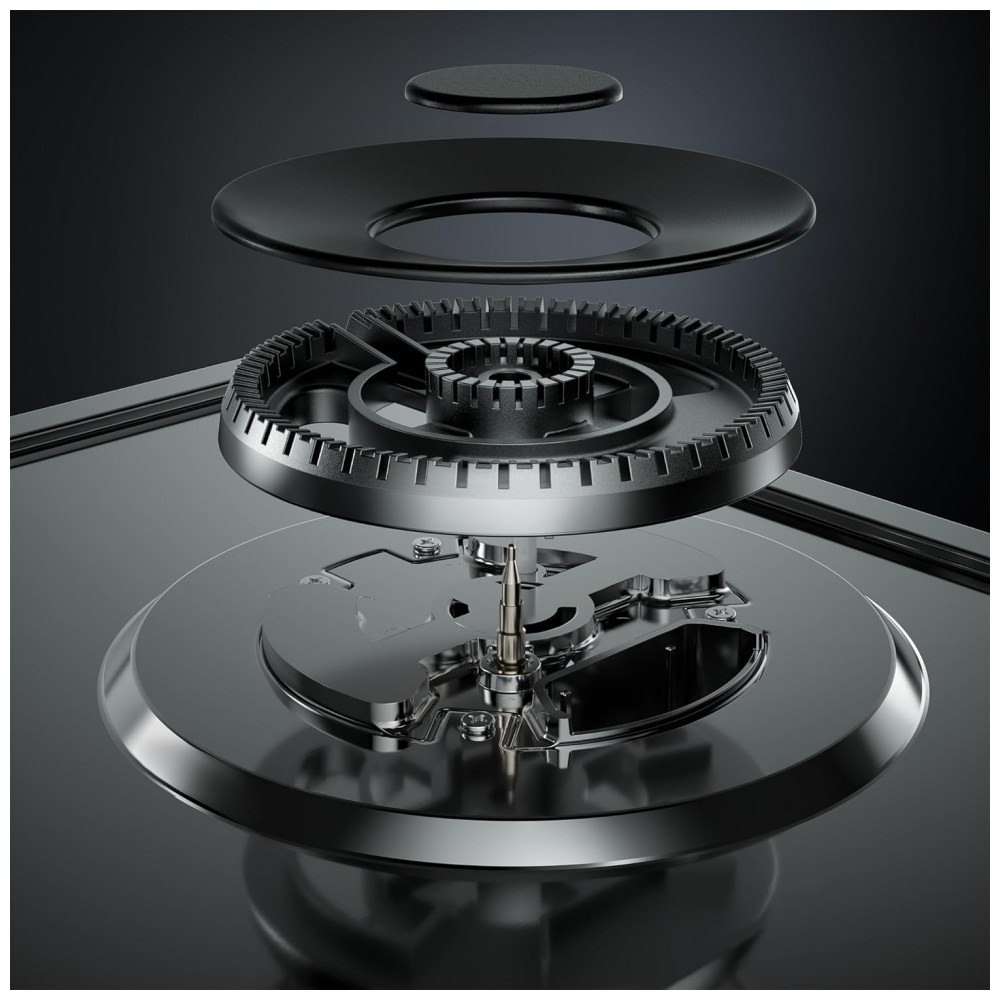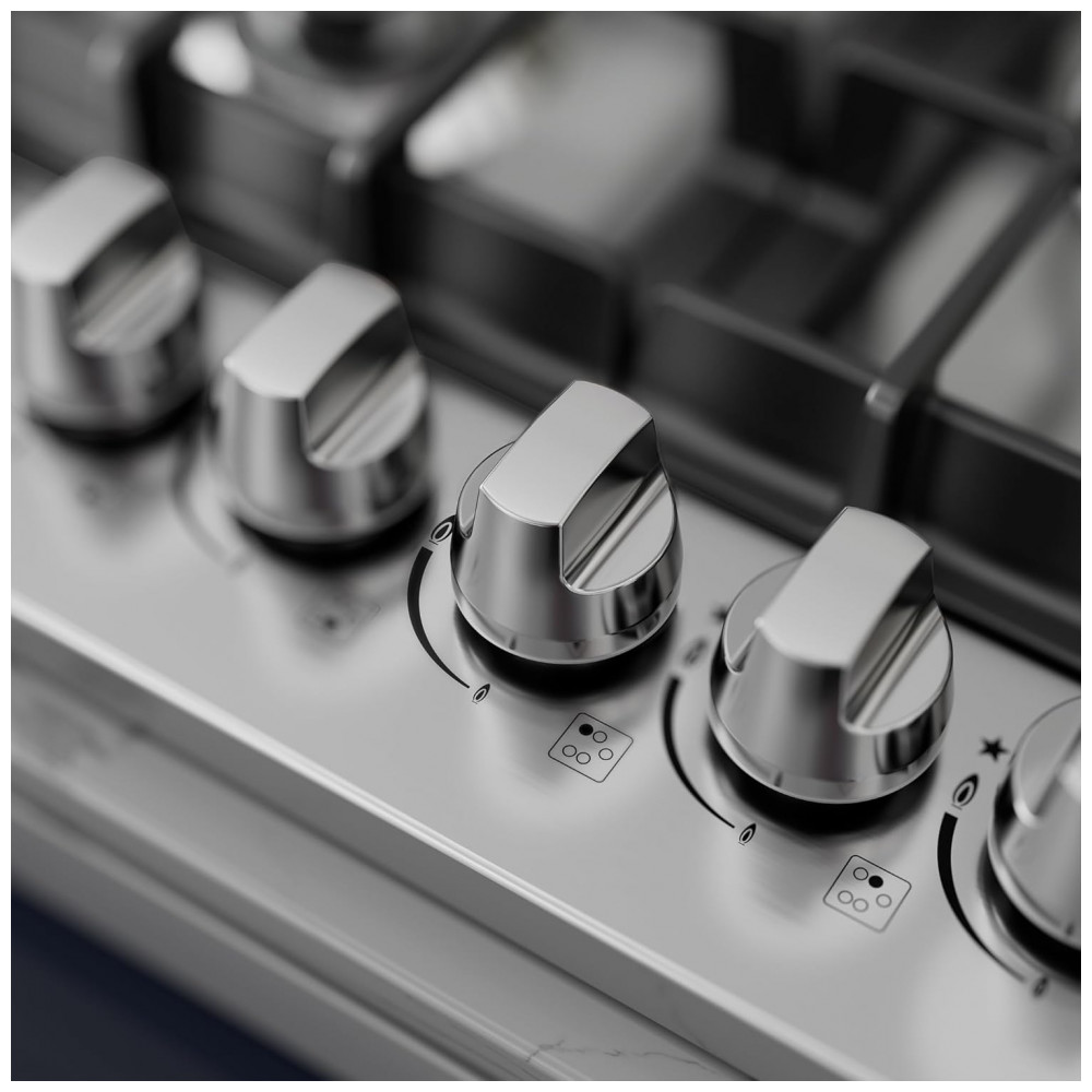 A configuração de aquecimento conta com um queimador triplo de 18000BTU, dois queimadores rápidos de 12000BTU, um queimador semirrápido de 9500BTU e um queimador auxiliar de 6000BTU, totalizando 57500BTU, permitindo desde fervuras rápidas e frituras em alta chama até cozimentos delicados em fogo baixo. As grades em ferro fundido de borda a borda funcionam como grade contínua, oferecendo apoio estável para panelas de diferentes diâmetros e facilitando o deslocamento entre as zonas de aquecimento sem necessidade de levantar os utensílios.