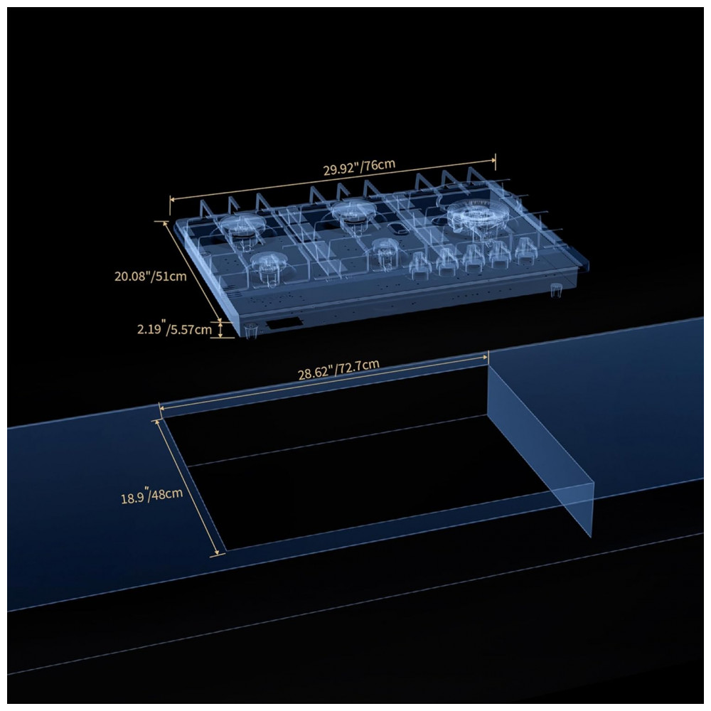 Com aproximadamente 76,0 cm de largura, 51,0 cm de profundidade e 10,2 cm de altura, o cooktop é adequado para recortes de bancada dimensionados para modelos de 30 polegadas convertidos ao sistema métrico. A combinação de mesa em inox, queimadores SABAF selados, grade contínua em ferro fundido e sistema de ignição por ionização torna o equipamento indicado para uso frequente em cozinhas planejadas.