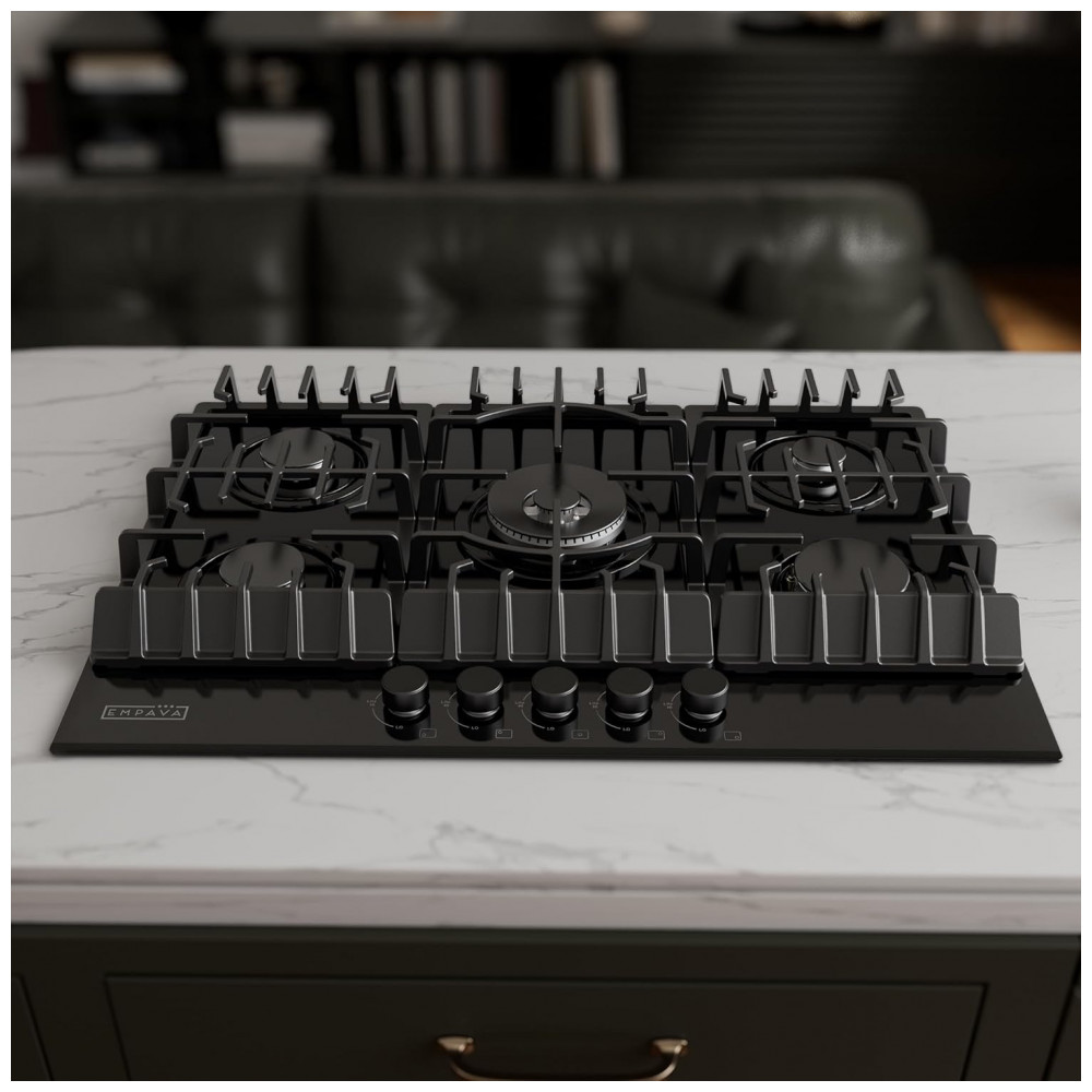 O cooktop a gás 76cm Empava com mesa em vidro temperado preto oferece cinco queimadores SABAF selados em configuração compacta para instalação embutida em cozinhas residenciais, cozinhas compactas e espaços gourmet planejados. A superfície em vidro temperado resiste a manchas e descoloração, enquanto os queimadores selados evitam a entrada de resíduos na base, favorecendo a limpeza com remoção das grades e pano úmido.
