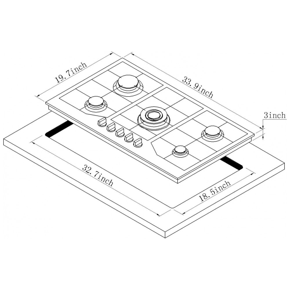 O acendimento automático utiliza ignição por pulso em 110V integrada aos manípulos, dispensando fósforos ou isqueiros e permitindo controle mais preciso da chama. As dimensões aproximadas de 86,1 cm de largura, 50,0 cm de profundidade e 7,6 cm de altura permitem instalação em recortes compatíveis com cooktops de 34″ convertidos para o padrão métrico.