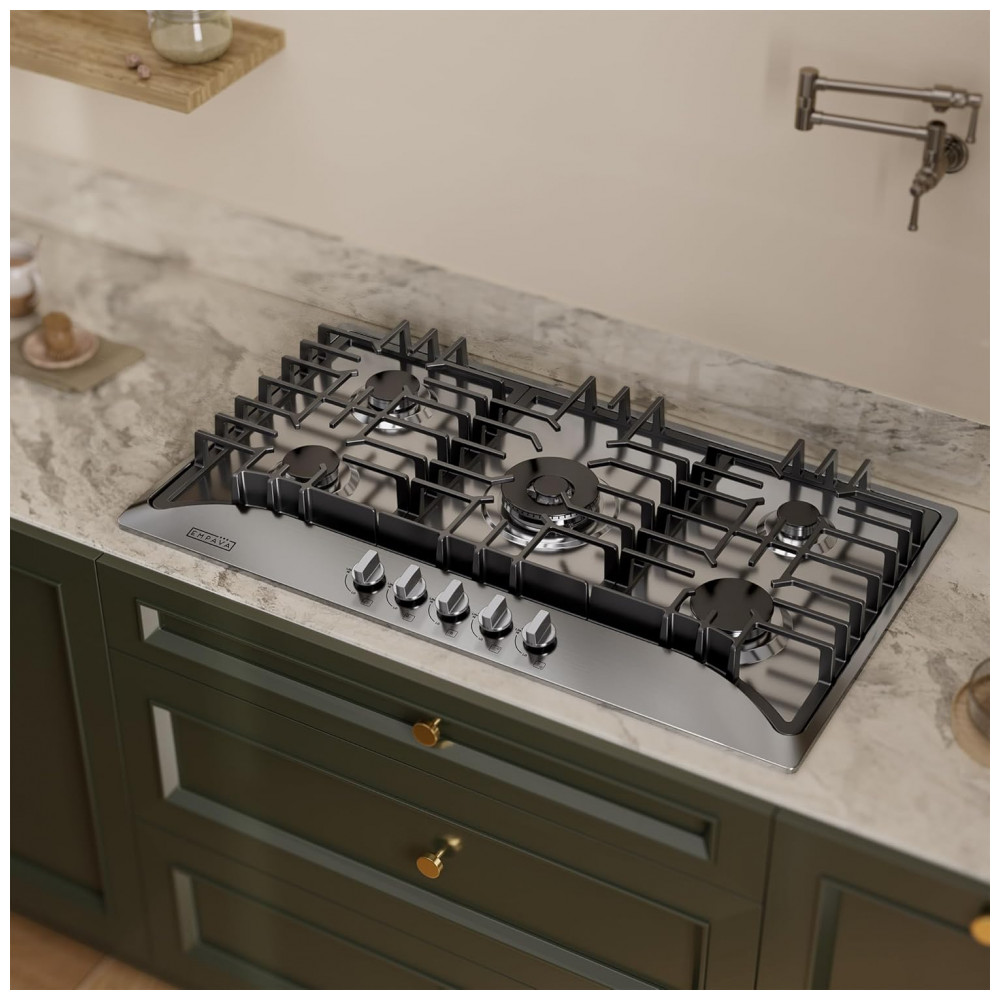 O cooktop a gás 91cm Empava em aço inoxidável utiliza cinco queimadores SABAF selados distribuídos em mesa rebaixada, indicado para instalação embutida em cozinhas residenciais e espaços gourmet. A superfície em inox é resistente a manchas e descoloração, enquanto os queimadores selados evitam a entrada de resíduos na base e facilitam a limpeza com remoção das grades e pano úmido.