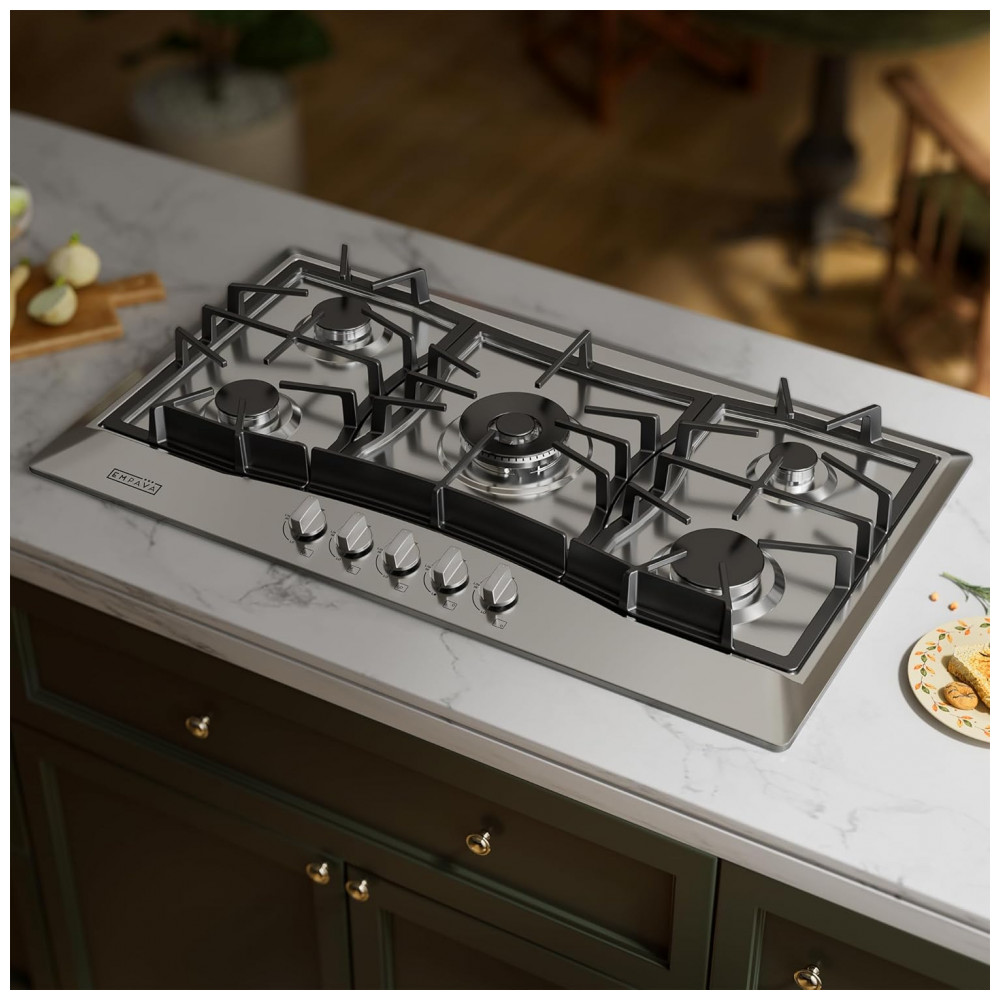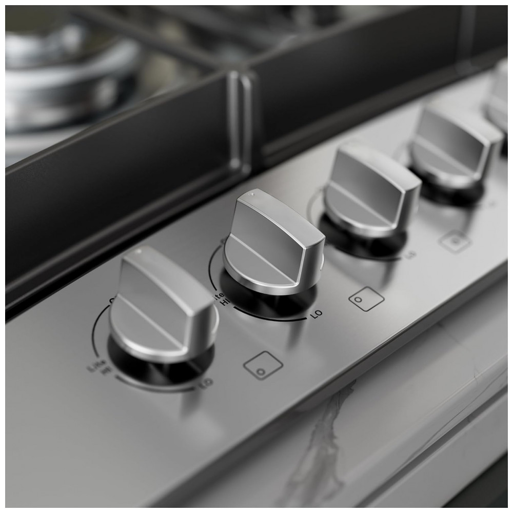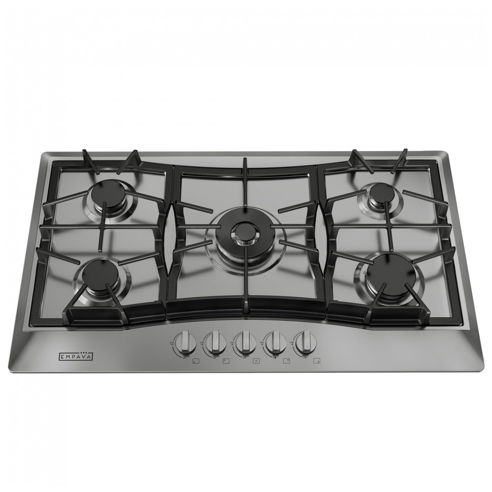 O cooktop a gás 91cm Empava em aço inoxidável utiliza cinco queimadores SABAF selados em mesa rebaixada, indicado para instalação embutida em cozinhas residenciais e espaços gourmet. A superfície em inox é resistente a manchas e descoloração, enquanto os queimadores selados reduzem o acúmulo de resíduos na base e facilitam a limpeza com remoção das grades e uso de pano úmido.
