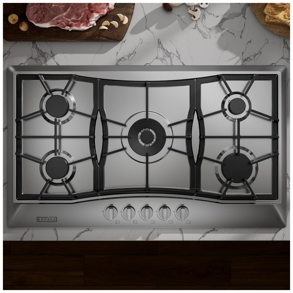 Cooktop a gás 91cm Empava inox 5 queimadores SABAF selados 57500BTU dual fuel GN/GLP ignição elétrica 110V