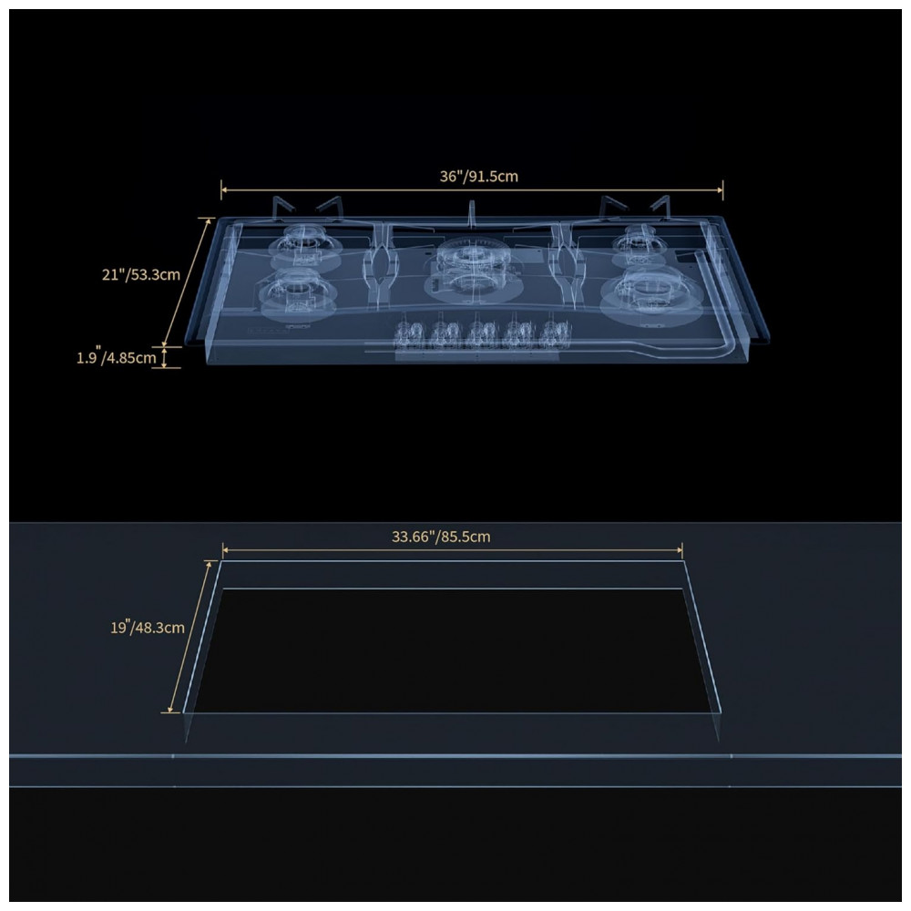 Com aproximadamente 91,5 cm de largura, 53,3 cm de profundidade e 9,7 cm de altura, o cooktop é adequado para instalação em recortes de bancada dimensionados para modelos de 36 polegadas convertidos ao sistema métrico. A combinação de mesa em inox, queimadores SABAF selados, grade contínua em ferro fundido, ignição elétrica e proteção por corte de gás torna o equipamento indicado para uso frequente em cozinhas planejadas.