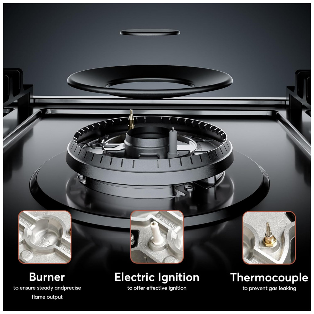 O cooktop a gás 91cm Empava em aço inoxidável utiliza cinco queimadores SABAF selados em mesa rebaixada, indicado para instalação embutida em cozinhas residenciais e espaços gourmet planejados. A superfície em aço inox resiste a manchas e descoloração, enquanto os queimadores selados evitam a entrada de resíduos na base, facilitando a limpeza com remoção das grades e pano úmido.