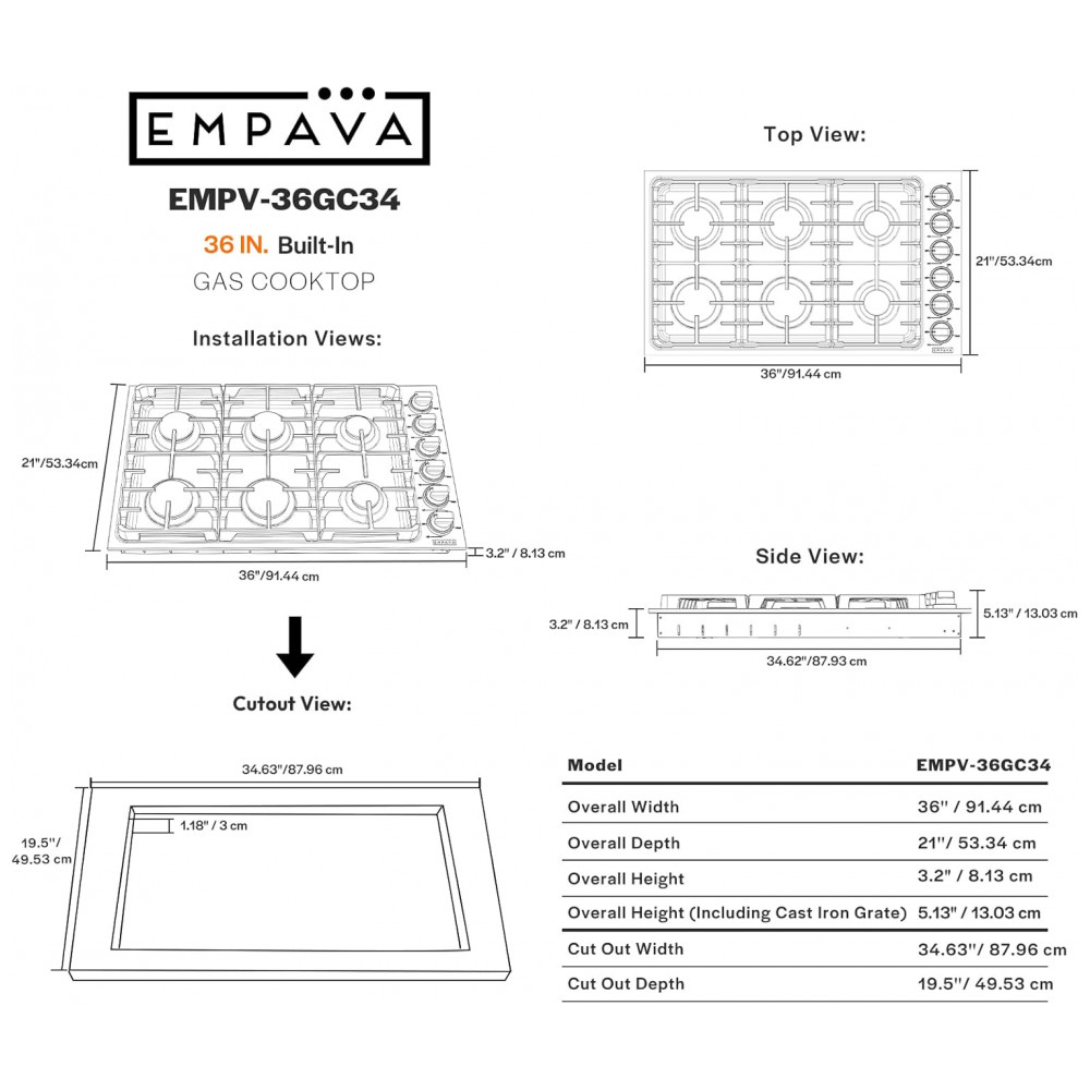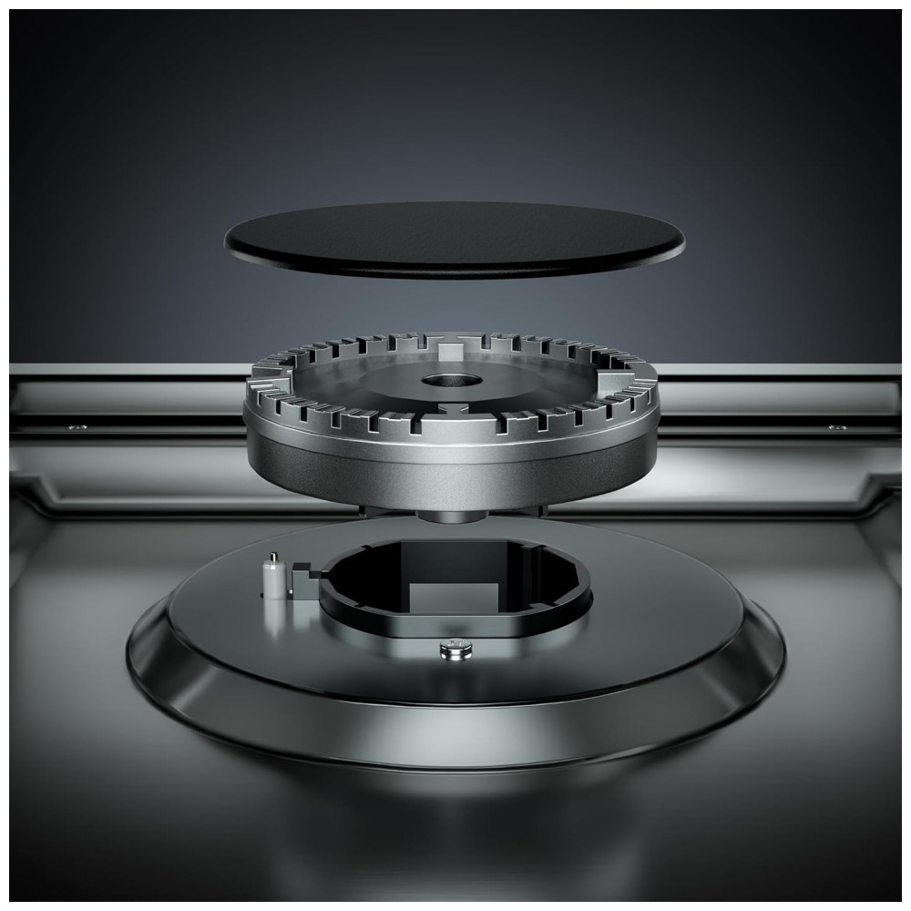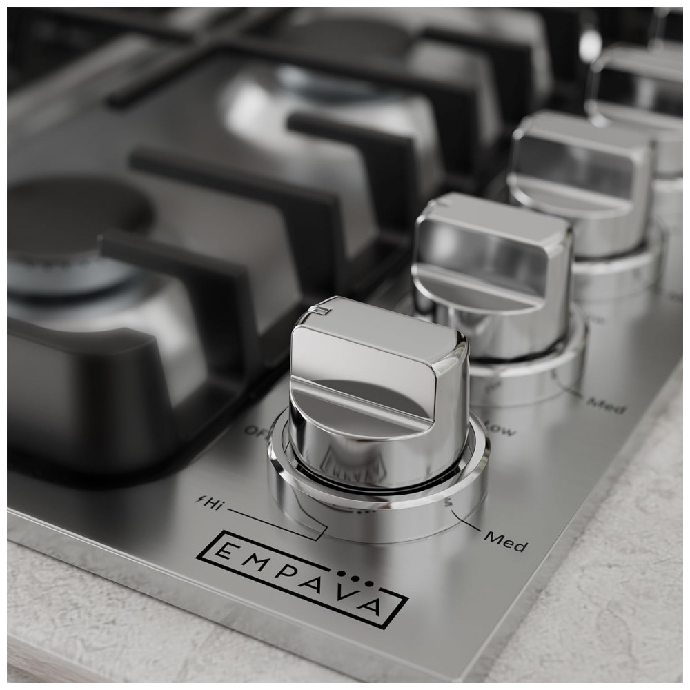 O cooktop a gás 91cm Empava em aço inoxidável utiliza seis queimadores SABAF selados em mesa rebaixada, indicado para instalação embutida em cozinhas residenciais e espaços gourmet. A superfície em inox 304 é resistente a manchas e descoloração, enquanto os queimadores selados reduzem o acúmulo de resíduos na base e facilitam a limpeza com remoção das grades e pano úmido.