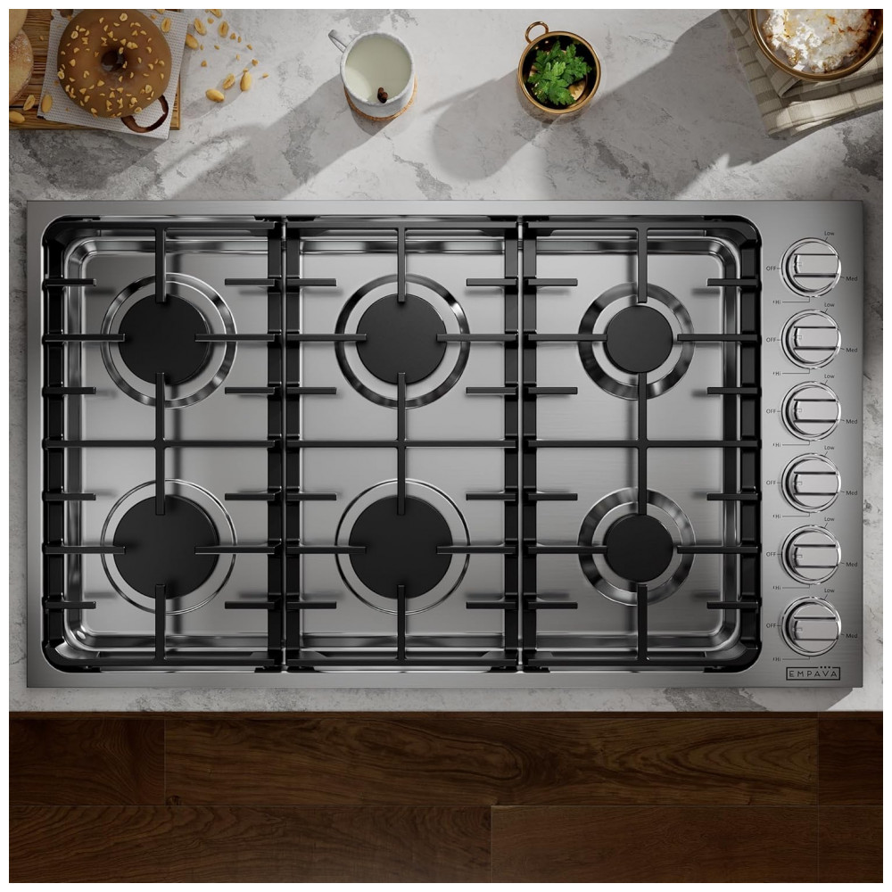 Cooktop a gás 91cm Empava inox 6 queimadores SABAF selados 72000BTU dual fuel GN/GLP ignição elétrica 110V