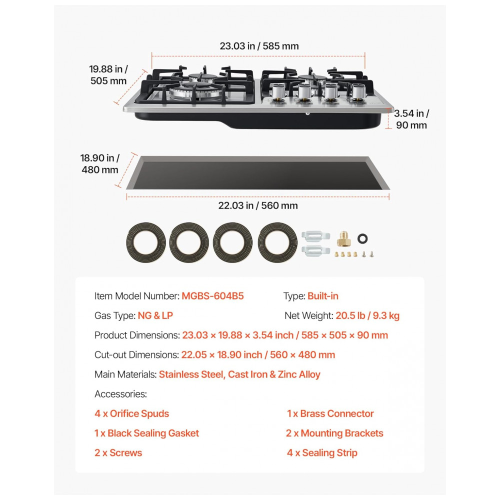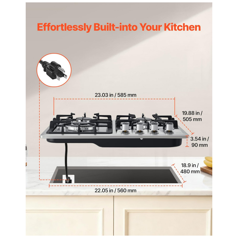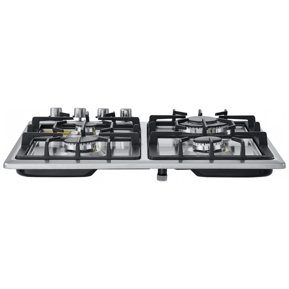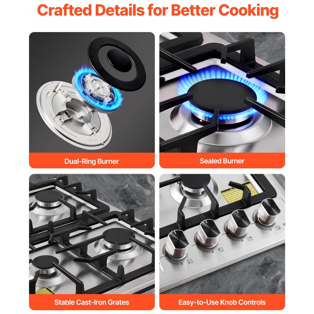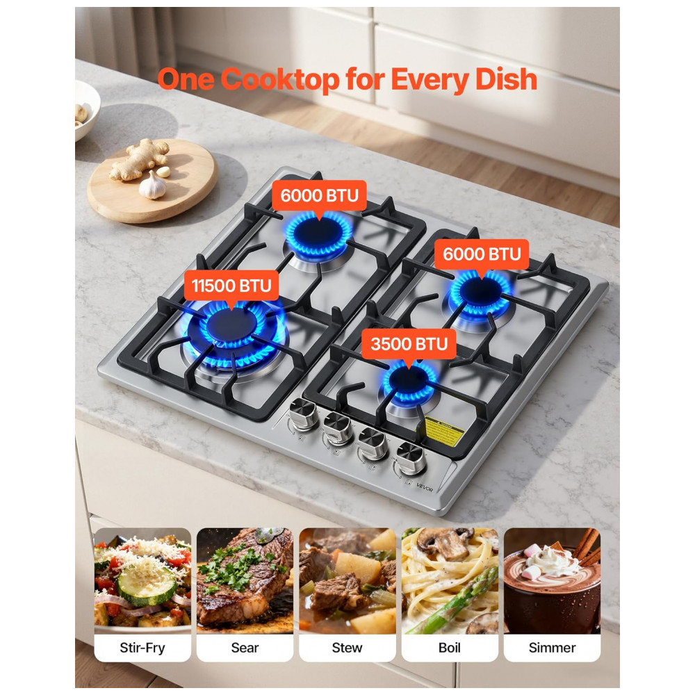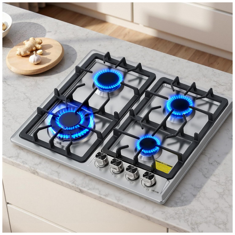 O cooktop a gás de embutir 58 cm VEVOR foi projetado para uso residencial com 4 queimadores selados e mesa em vidro temperado preto com faixa em aço inox, oferecendo visual moderno e facilidade de limpeza. A alimentação a gás natural com possibilidade de conversão para GLP permite adaptação ao tipo de gás disponível na instalação. As grades em ferro fundido removíveis garantem apoio estável para panelas e facilitam o acesso à superfície para higienização.
