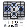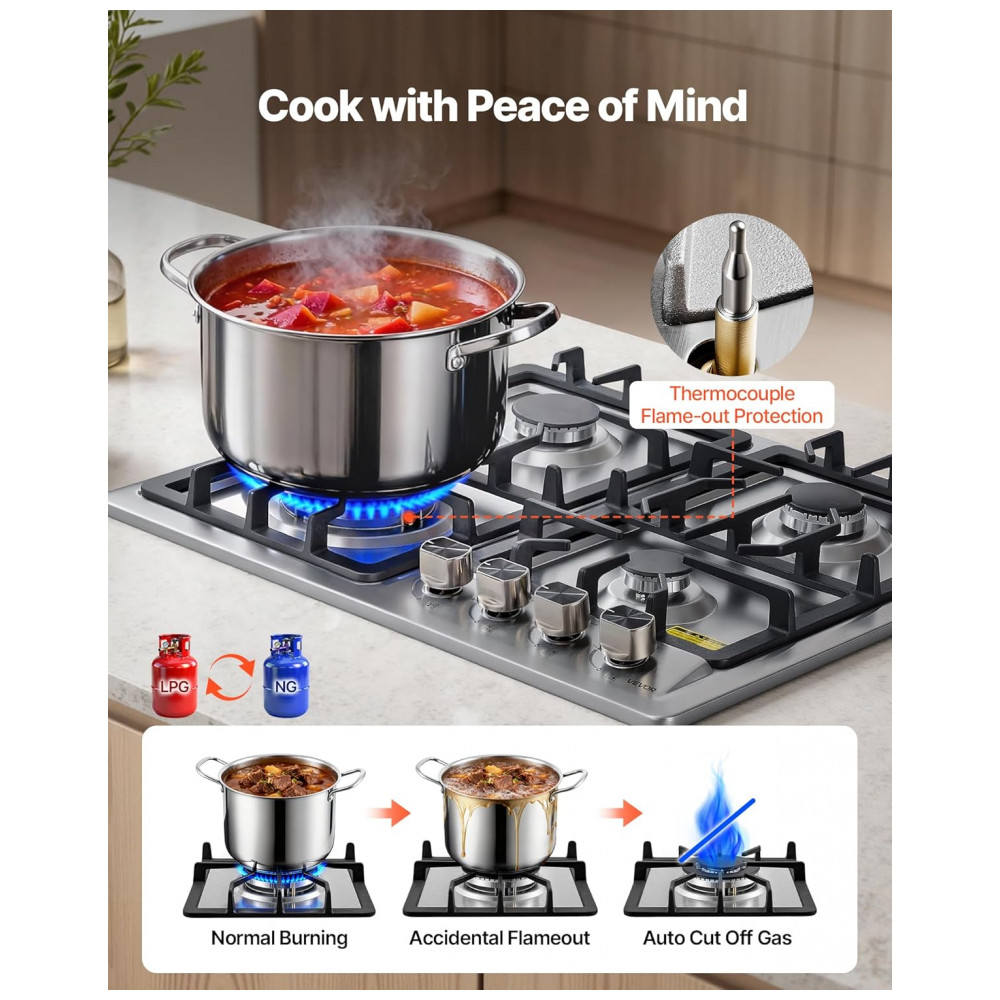 Cooktop a gás de embutir 58 cm VEVOR vidro temperado preto/inox 4 queimadores dupla alimentação GN/GLP proteção termopar 110V