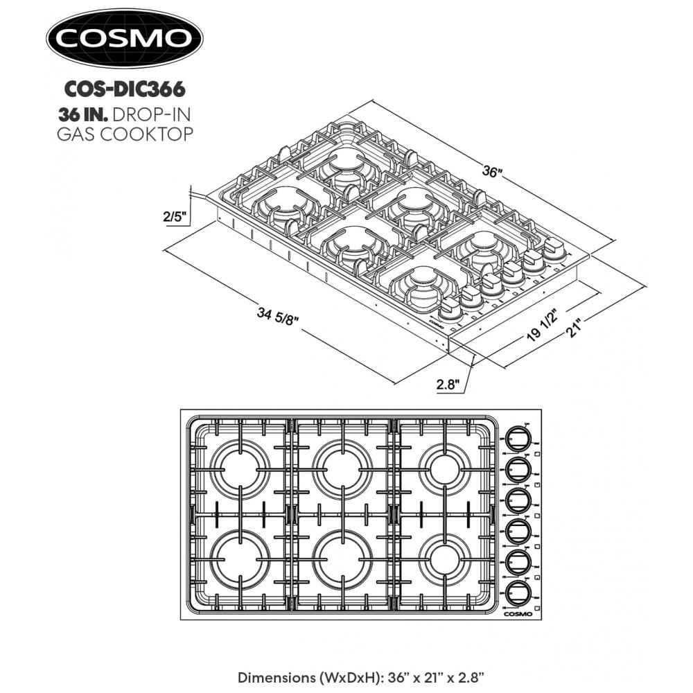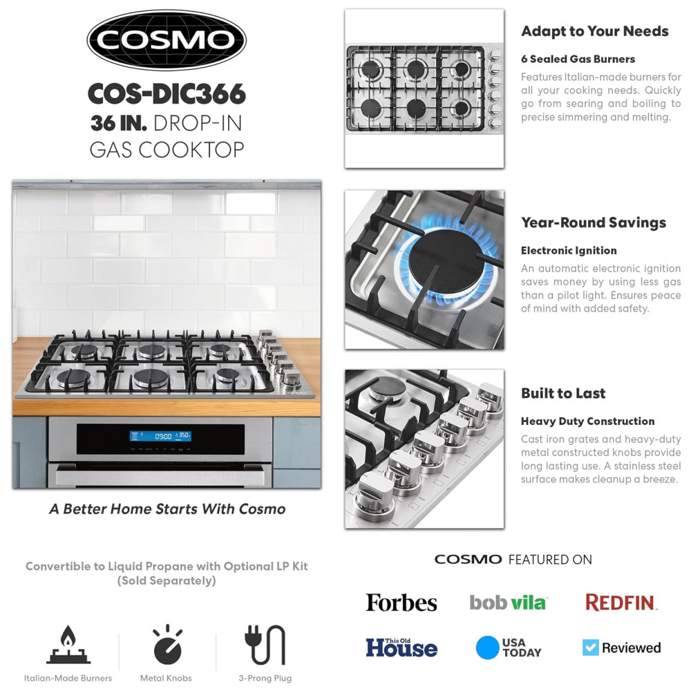 Conteúdo da embalagem: Cooktop a gás Cosmo COS-DIC366 grades em ferro fundido kit de conversão para GLP conjunto de bicos e acessórios básicos de instalação manual de instalação e manual do usuário