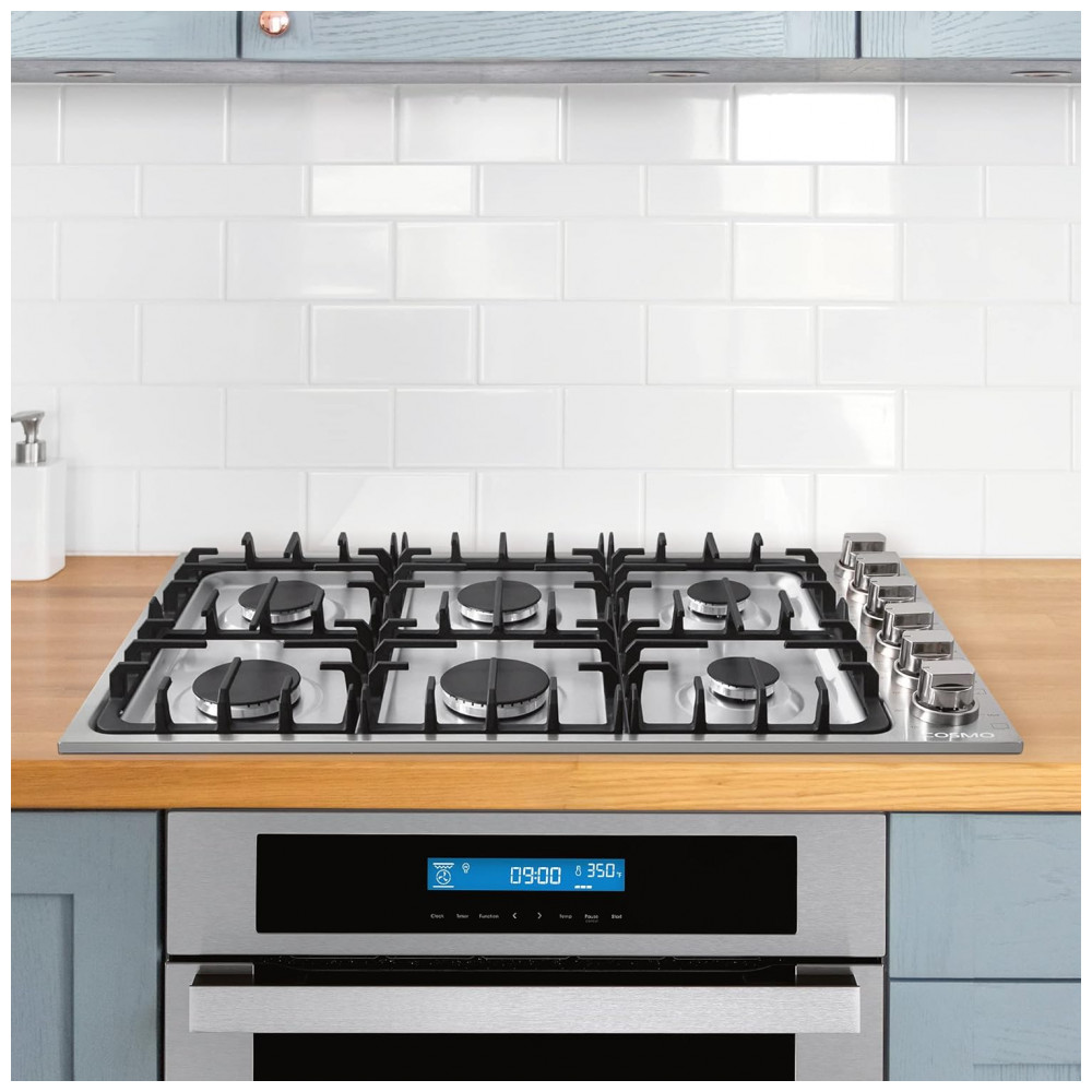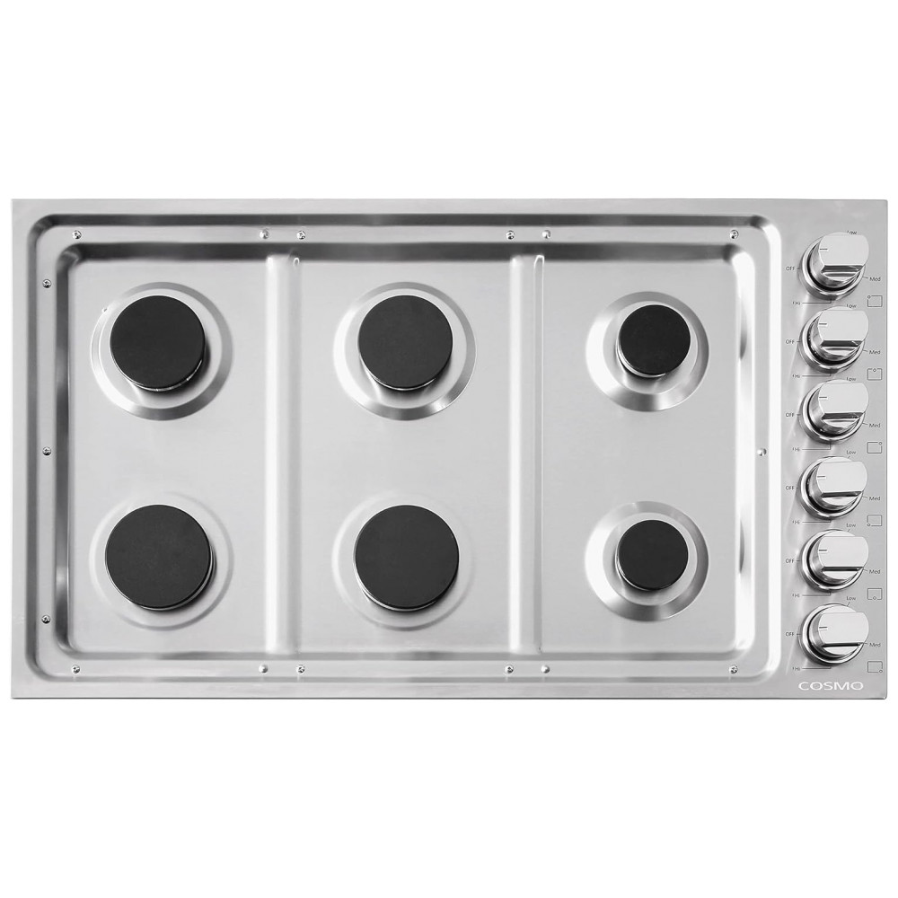 O cooktop a gás de embutir Cosmo é indicado para uso residencial em bancadas, utilizando gás como fonte de aquecimento e energia elétrica apenas para o sistema de ignição. A mesa em aço inoxidável com cerca de 91 cm de largura acomoda seis queimadores italianos selados, permitindo o preparo simultâneo de múltiplas panelas e recipientes em diferentes intensidades de chama.