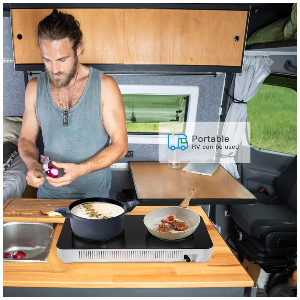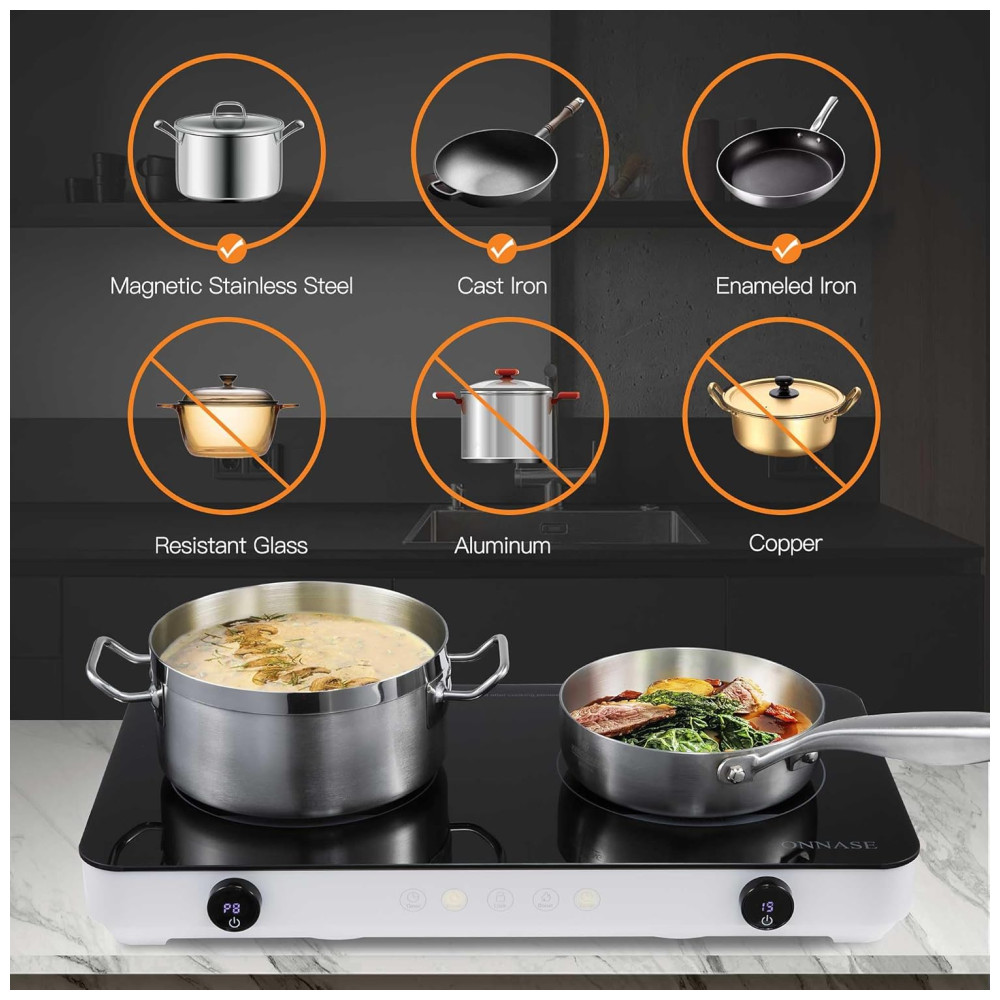 Ampla Gama de Aplicações: Este cooktop de indução duplo é compatível com aço magnético, ferro fundido, aço inoxidável e ferro esmaltado. Você também pode optar por comprar um adaptador de placa quente para cooktops de indução que pode ser utilizado com outros materiais de utensílios de cozinha.