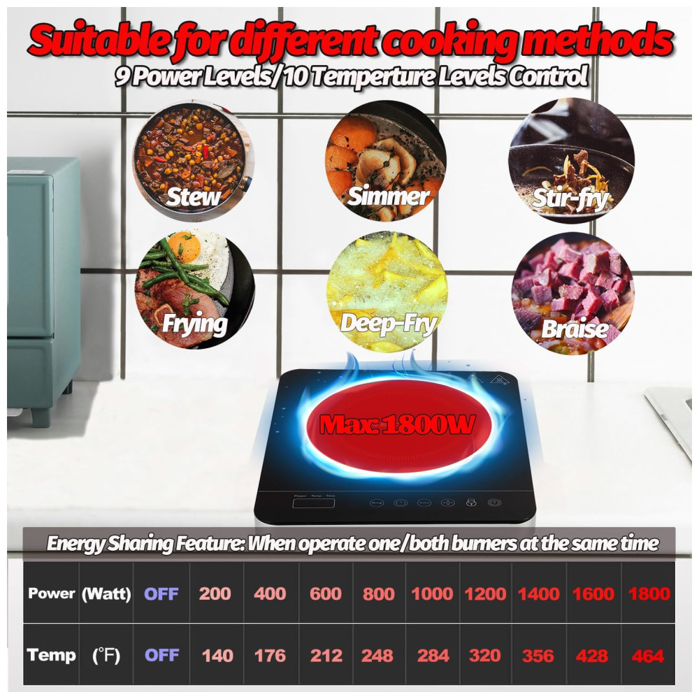 9 Níveis de Potência e 10 Níveis de Temperatura: O cooktop de indução portátil possui 9 níveis de potência, de 200W a 1800W, permitindo ajustar a potência para cozinhar sopas, feijões, molhos, espaguete e muito mais. Além disso, com temperatura ajustável (de 60°C a 240°C), você pode usá-lo para grelhar bifes, bacon, ovos mexidos, grelhar e muito mais.