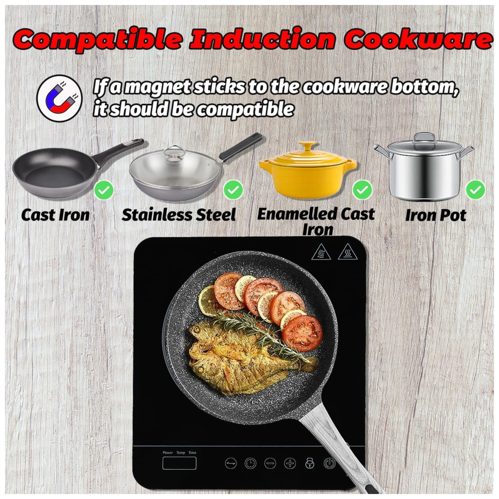 Econômico em Energia: O poderoso queimador de indução aquece apenas o diâmetro da panela, sem desperdiçar energia. Além disso, o aquecimento é instantâneo e distribuído uniformemente, cozinhando seus alimentos 50% mais rápido do que cooktops a gás ou elétricos convencionais. O cooktop é adequado para panelas compatíveis com indução, com bases ferrosas planas (teste com um ímã), como ferro fundido, aço esmaltado ou aço inoxidável magnético, com diâmetro de base entre 12 cm e 26 cm.