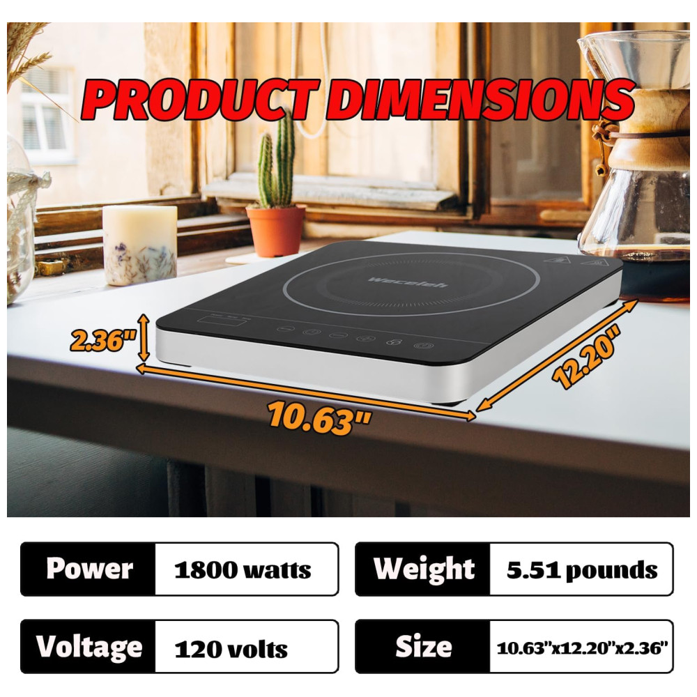 Prático e Portátil: O altamente versátil Cooktop de Indução Weceleh possui 1800W de potência de cozimento e muitos recursos inteligentes ao seu alcance. Opera em 110V padrão, e o queimador de indução leve é fácil de manusear e armazenar, ideal para trailers, pequenos apartamentos ou qualquer lugar onde você precise de um cooktop extra. Sem bobinas quentes ou chamas abertas, oferece uma maneira prática de criar pratos deliciosos.
