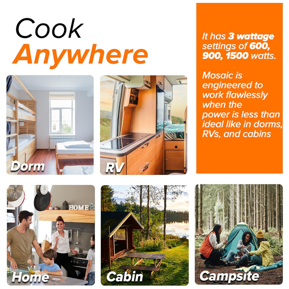 O Mosaic é um fogão de indução portátil e leve, ideal para trailers, dormitórios, acampamentos e apartamentos menores. Com seus controles digitais intuitivos, é fácil ajustar a temperatura a qualquer momento, sem a necessidade de começar do zero. O Mosaic oferece seis configurações de temperatura predefinidas convenientes ou permite que você ajuste sua própria temperatura de 37 A 300ºC em incrementos de -15ºC. Você também pode adicionar ou subtrair o tempo de cozimento a qualquer momento. Com suas três configurações de potência de 900, 1.500 e 1.800 watts, o Mosaic foi projetado para funcionar bem em qualquer lugar, mesmo quando a potência é limitada.