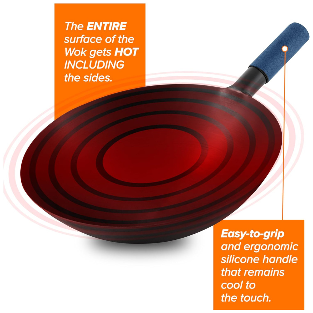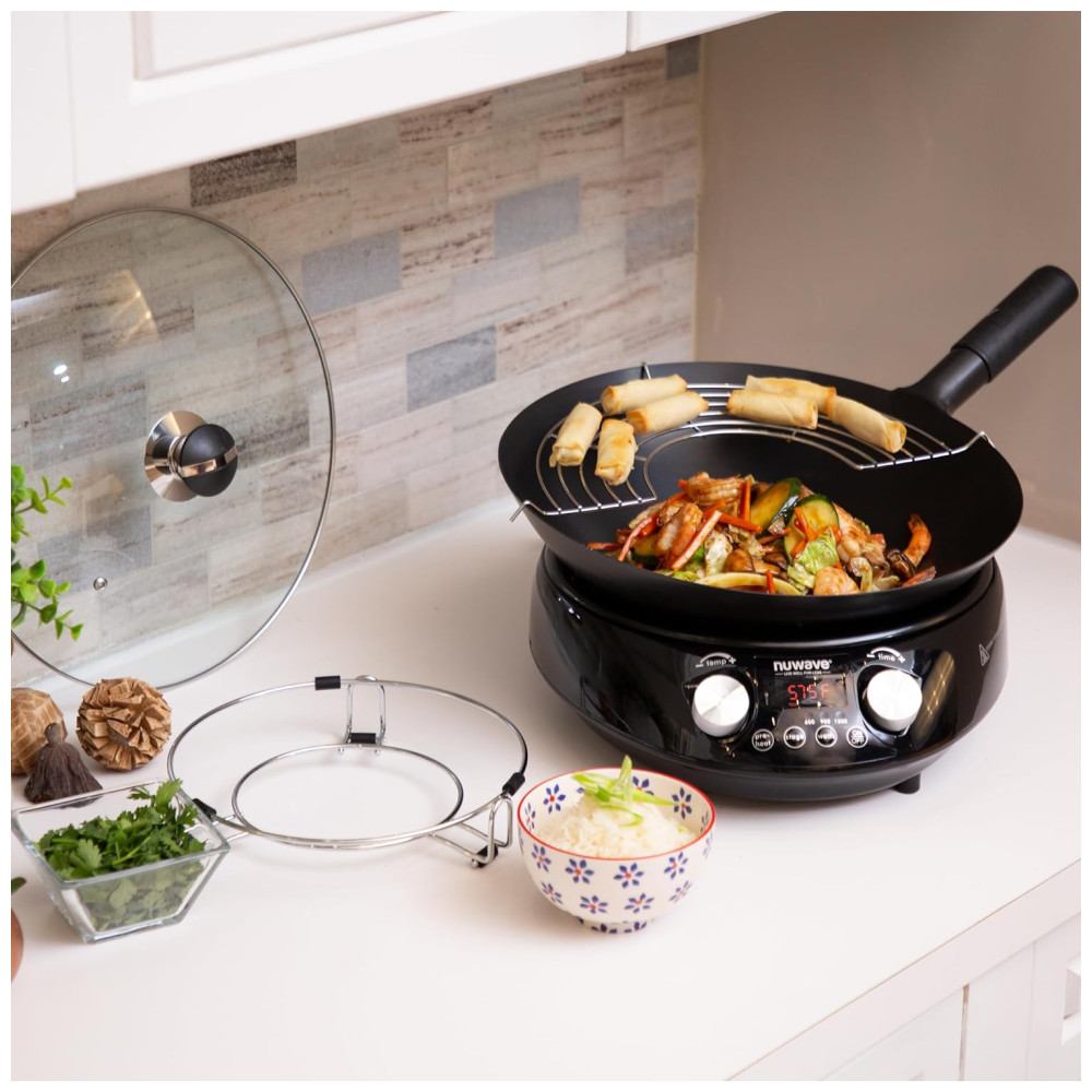 O wok incluído é meticulosamente construído com aço carbono de qualidade profissional de alta qualidade e é extremamente antiaderente, resistente a arranhões, fácil de limpar e durará a vida toda. Com tempero e manutenção adequados, o wok pode atingir a temperatura perfeita para fritar em menos de um minuto, permitindo que você obtenha Wok Hei para infundir aromas e sabores carbonizados complexos em seus pratos favoritos. O Mosaic é uma escolha rápida, eficiente e segura para cozinhar e inclui uma base wok de indução personalizada, tampa de vidro temperado ventilada, cremalheira de fritura de aço inoxidável, suporte wok de metal personalizado e manual do proprietário.
