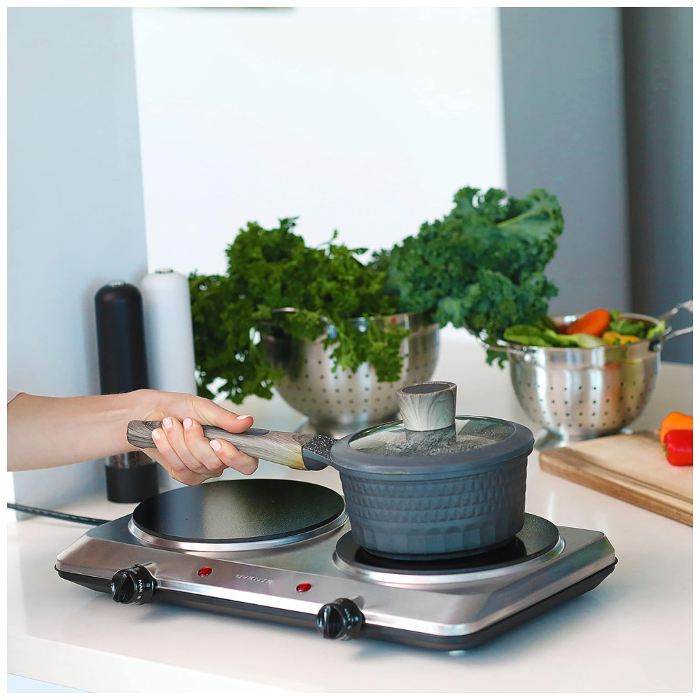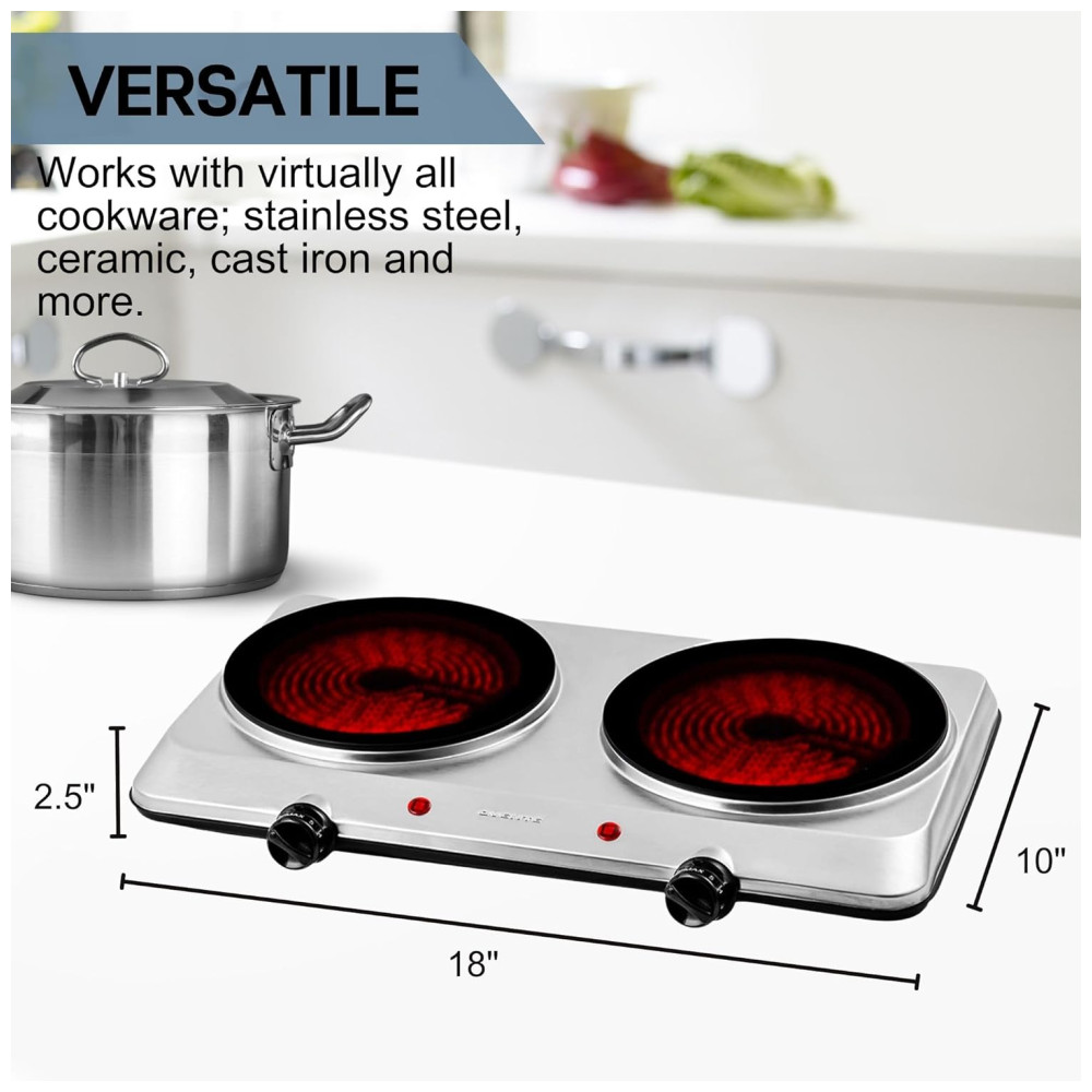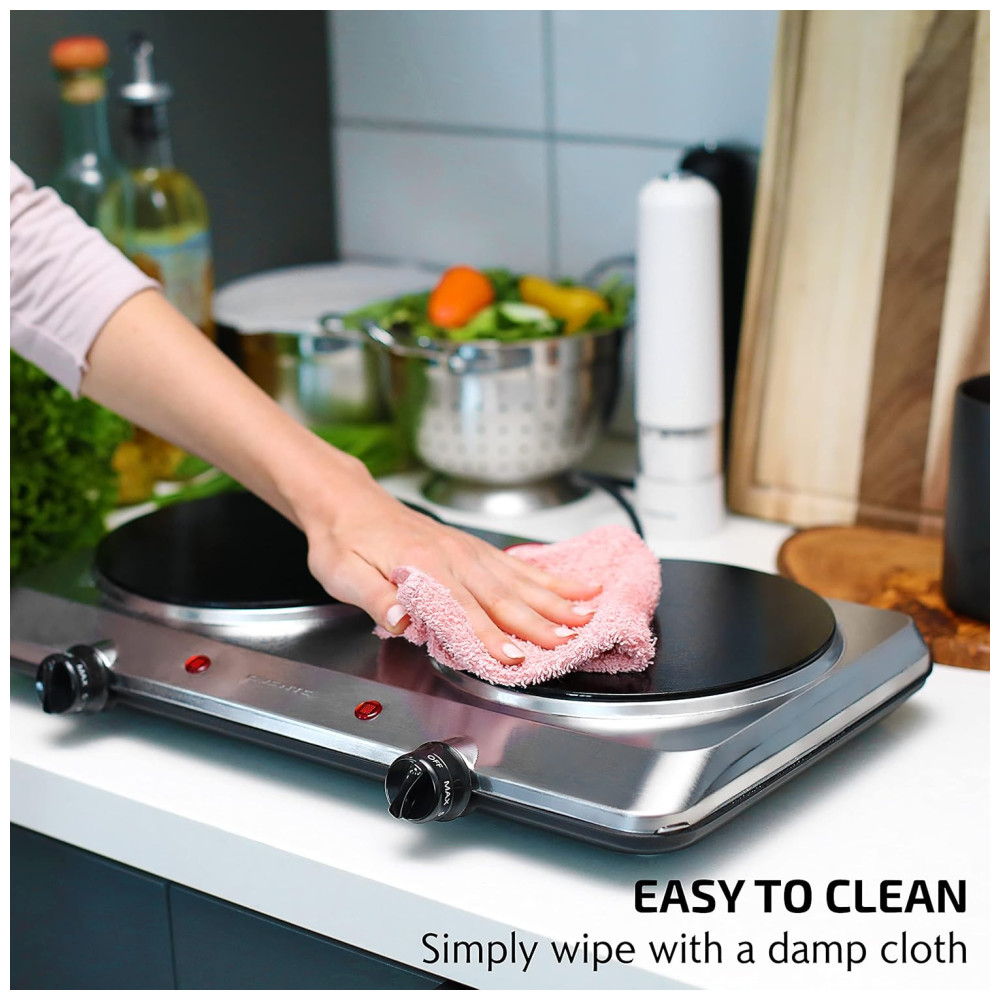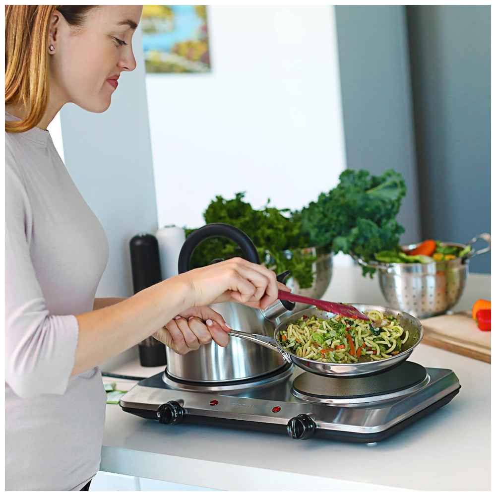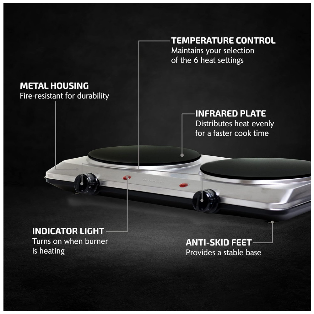 Tenha refeições caseiras quentes e frescas a qualquer momento e em qualquer lugar com o Cooktop Duplo Infravermelho OVENTE. Uma alternativa aos fogões tradicionais, oferecendo alto desempenho sem restrições de utensílios. Com controle de termostato para aquecer e cozinhar de forma uniforme, mantendo a temperatura constante conforme desejado. Com 1500 watts de potência, compacto e leve, fácil de armazenar em armários ou malas. Design moderno que combina com qualquer ambiente, perfeito para receber convidados em festas. Ideal para estudantes, jovens adultos, espaços pequenos, viagens e camping. Sem chamas, pés de borracha antiderrapantes, seguro e fácil de usar. EXPERIÊNCIA DE COZIMENTO SEM ESTRESSE com 1500 watts de potência. Tecnologia infravermelha para aquecer rapidamente e de forma uniforme, ideal para fritar, manter a comida aquecida, ferver água ou sopa. COMPATÍVEL COM TODOS OS UTENSÍLIOS DE COZINHA, funciona com praticamente todos os tipos de panelas. Controle de temperatura ajustável, indicador luminoso, desligamento automático em caso de superaquecimento. ELEGANTE E PORTÁTIL, com estrutura em aço inoxidável e tampo em cerâmica cristalina, perfeito para qualquer balcão. Fácil de limpar, basta passar um pano úmido.