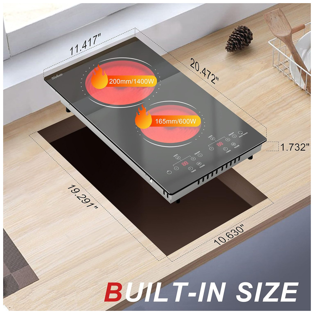 Cooktop Elétrico 2 Bocas 110v Fogão de Mesa 30cm Radiante Embutido c/ Bloqueio de Segurança e Proteção InfantilHobsir hob