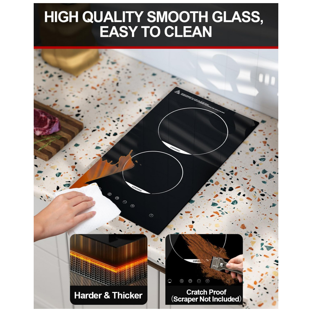 Este cooktop elétrico de 110v com plugue de 30,48 cm é perfeito para quem busca praticidade, pois dispensa a necessidade de um eletricista para instalação. Compatível com panelas de diversos materiais, como ferro, aço inoxidável, cerâmica, vidro e outros resistentes a altas temperaturas. Com 2 queimadores, um de 1000W e outro de 800W, oferece 9 níveis de potência para cozinhar, ferver, cozinhar no vapor, refogar e muito mais. Além disso, conta com funções de segurança como trava para crianças, timer de até 99 minutos, desligamento automático, aviso de calor residual e pausa. Seu design moderno em vidro cerâmico preto é fácil de limpar e muito resistente. Verifique a compatibilidade antes de comprar.