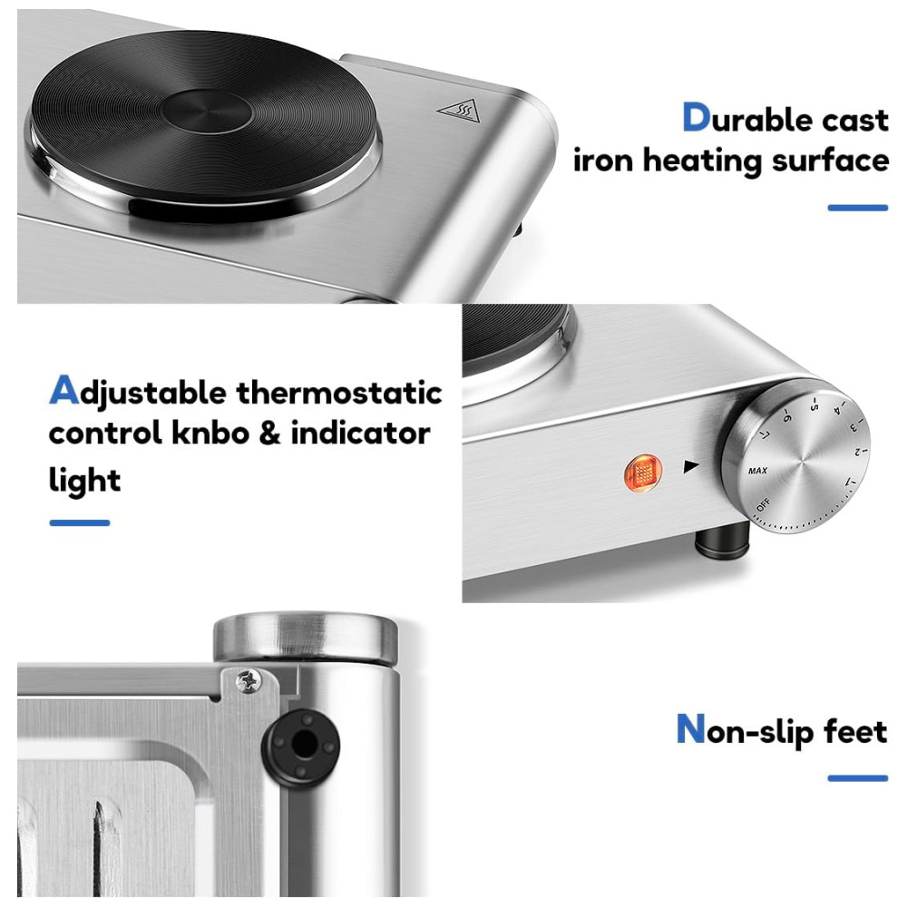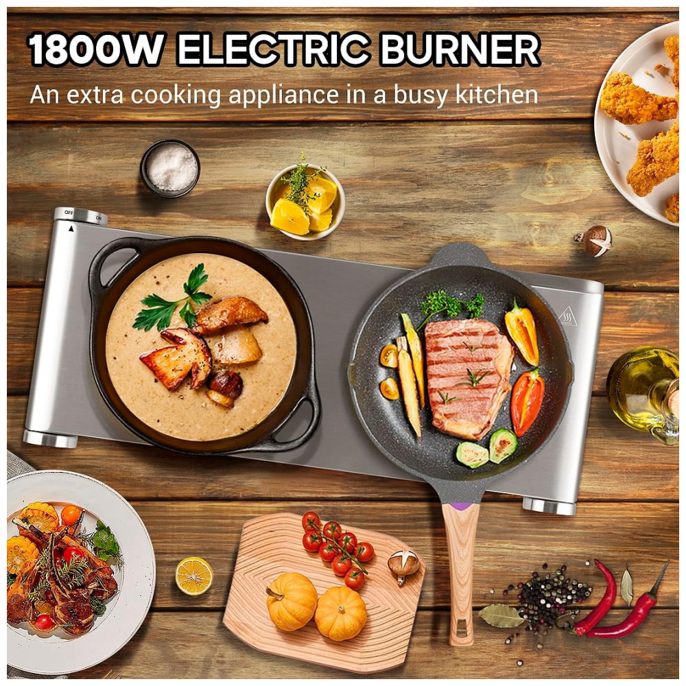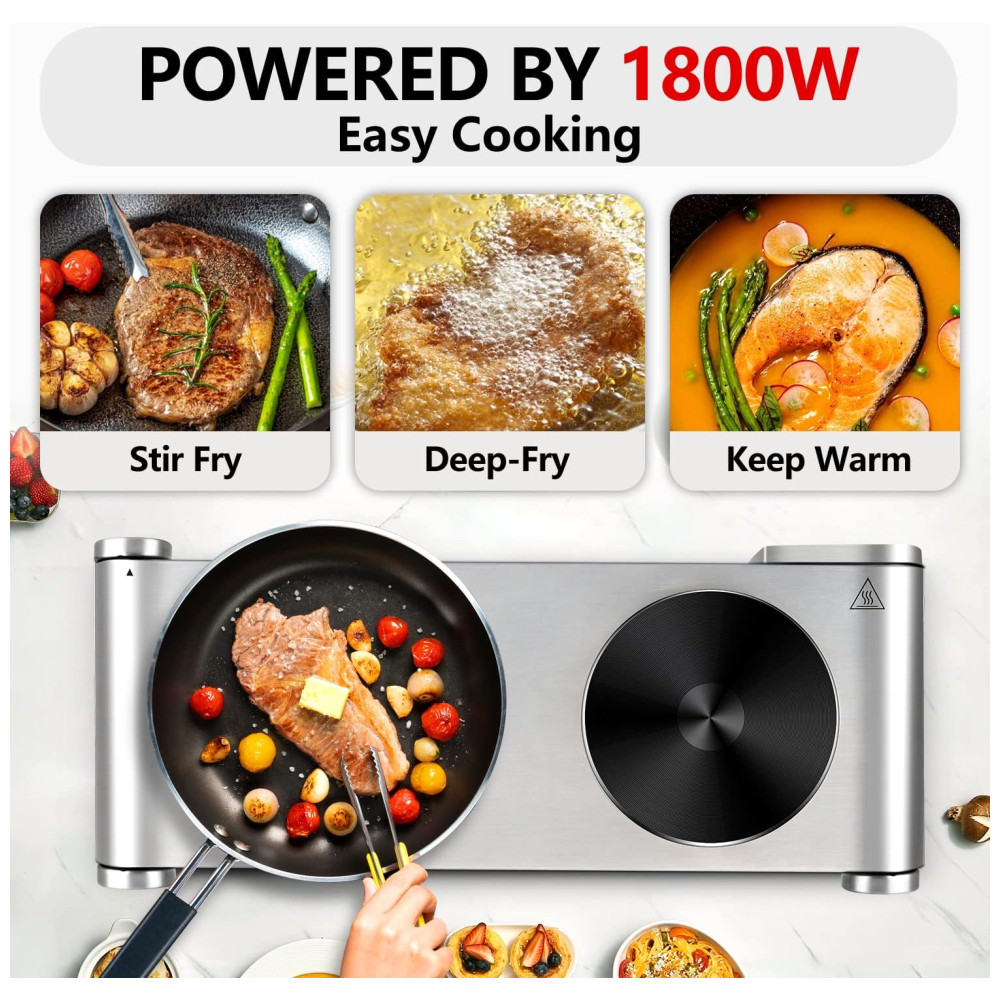 Potência de 900+900W e Cozimento Independente: Nosso queimador duplo possui controle de temperatura ajustável com 7 configurações de aquecimento controladas termostaticamente, ajudando você a cozinhar livremente e com facilidade. Conveniente para cozinhar uma variedade de alimentos, como fritar bife, queijo grelhado, ferver água, fazer sopa, cozinhar massa, aquecer molhos e muito mais, até mesmo manter a comida aquecida. Perfeito para uso diário ou como um aparelho de cozinha extra em uma cozinha movimentada.